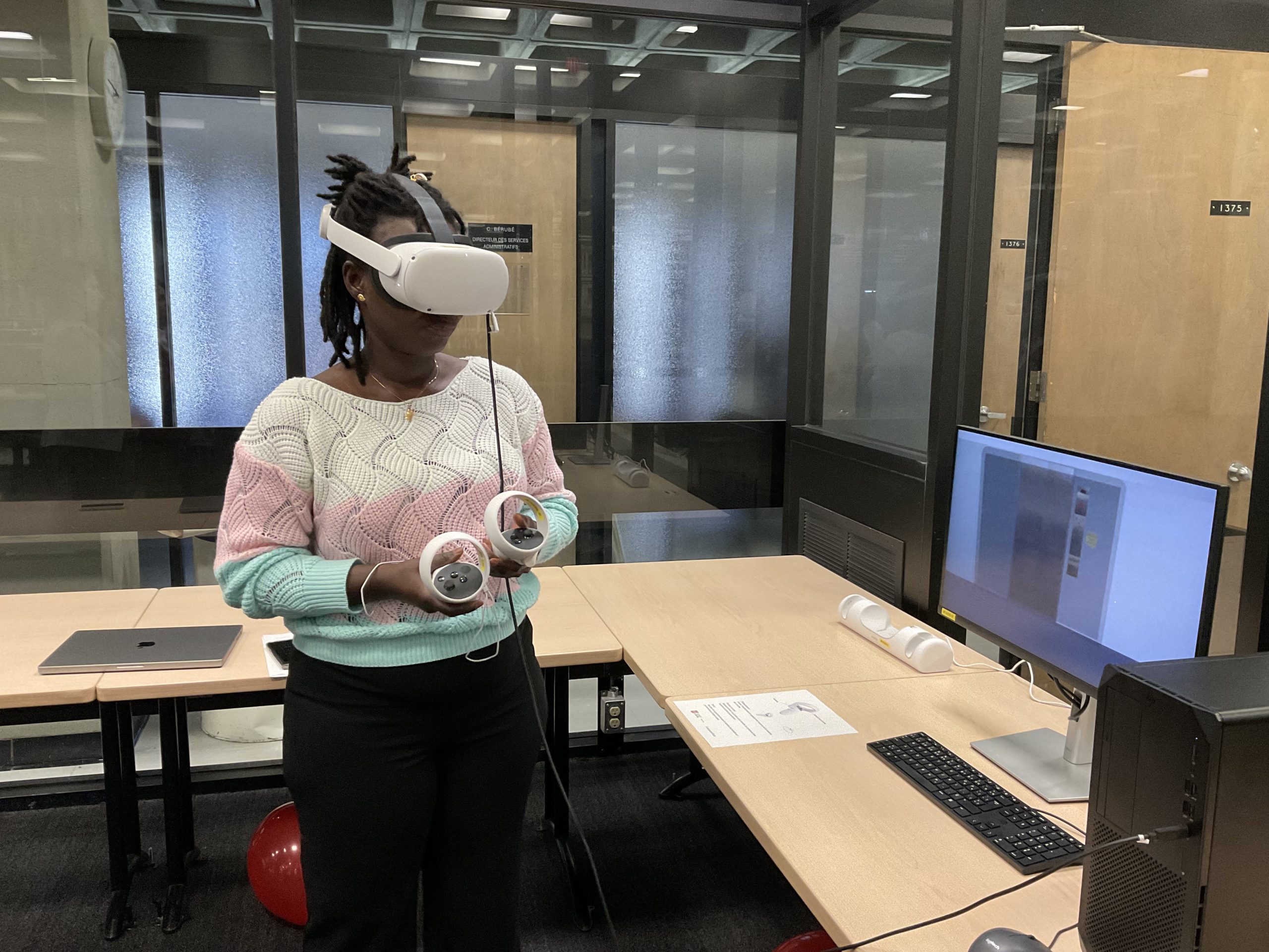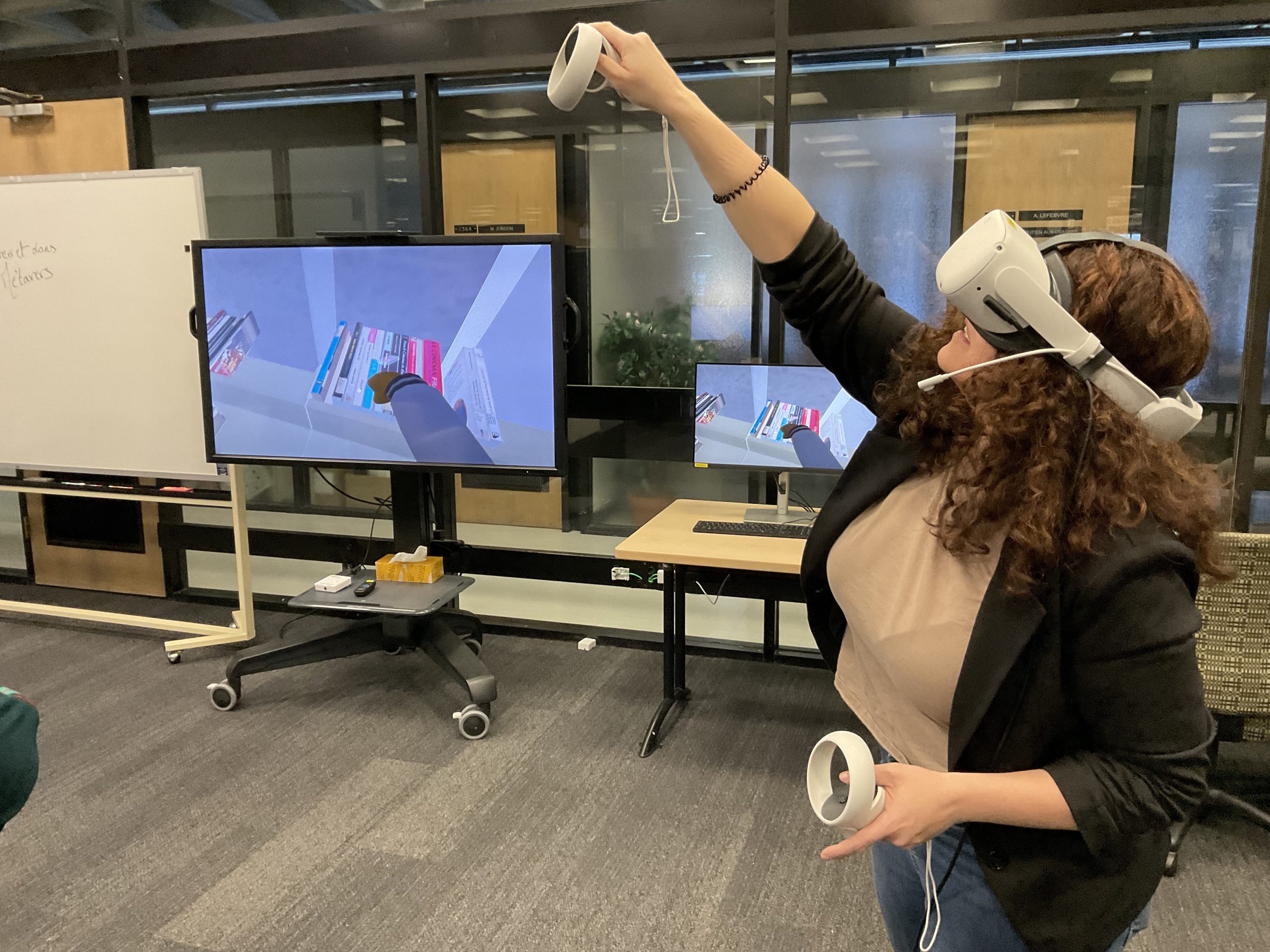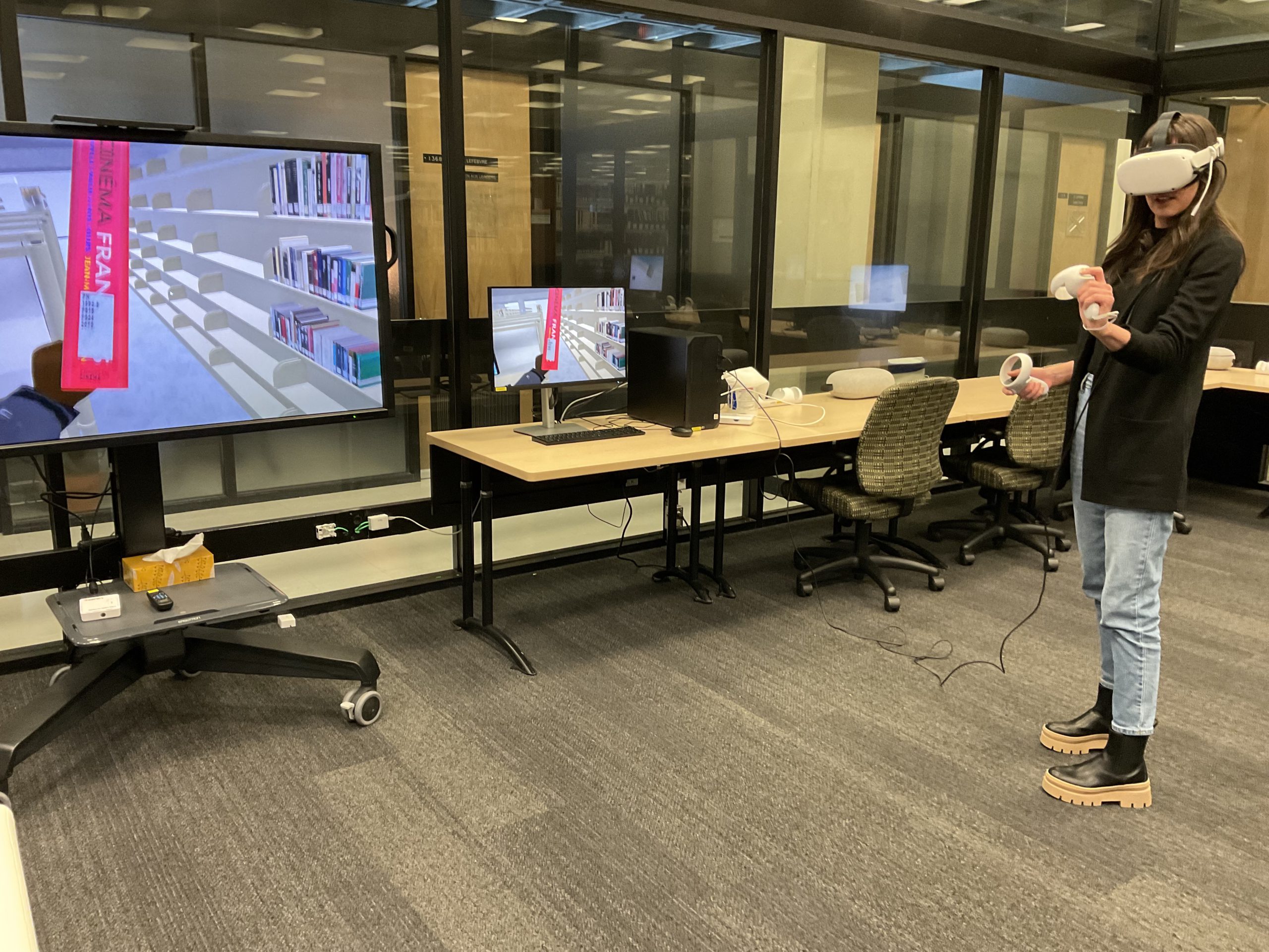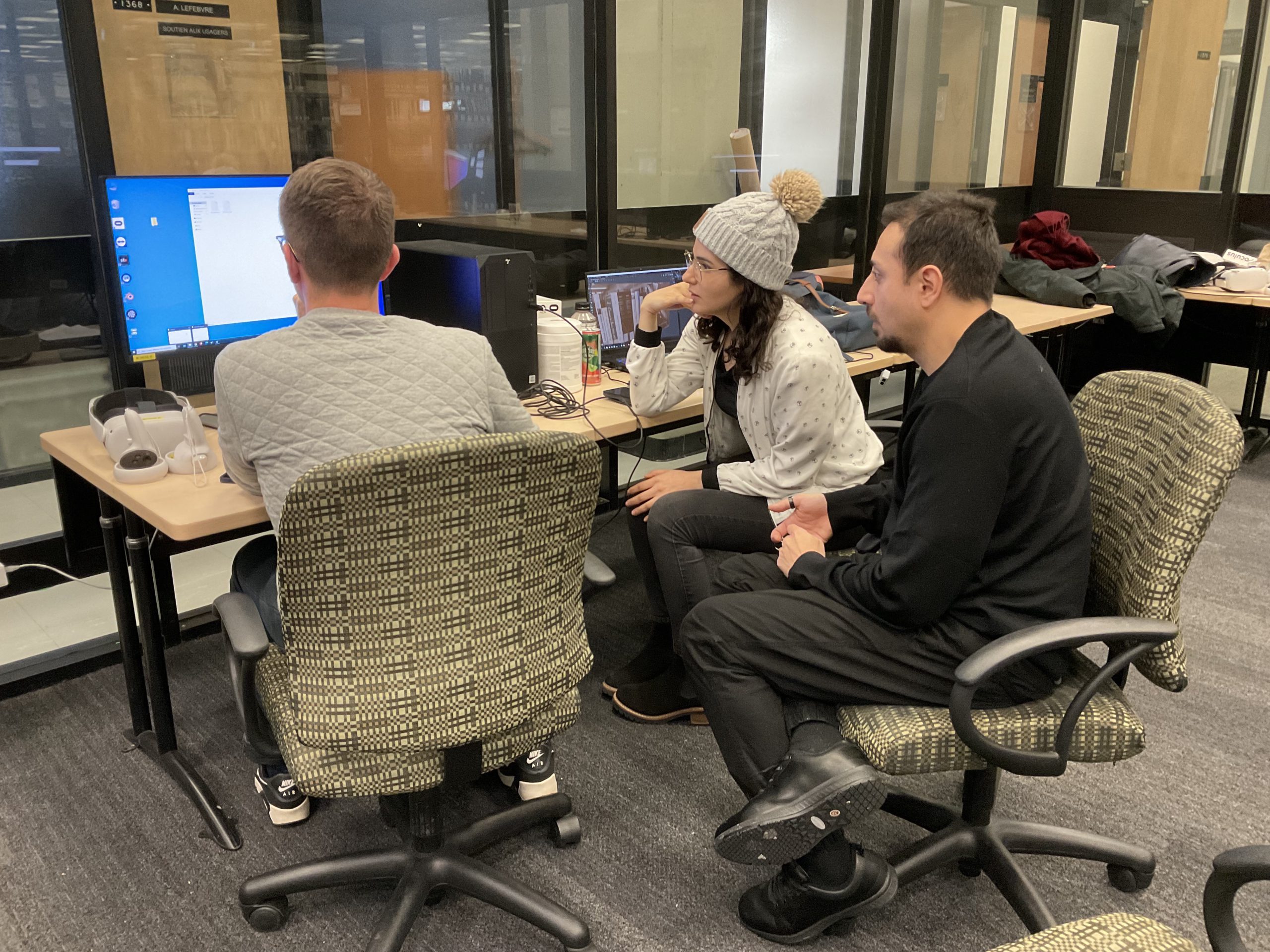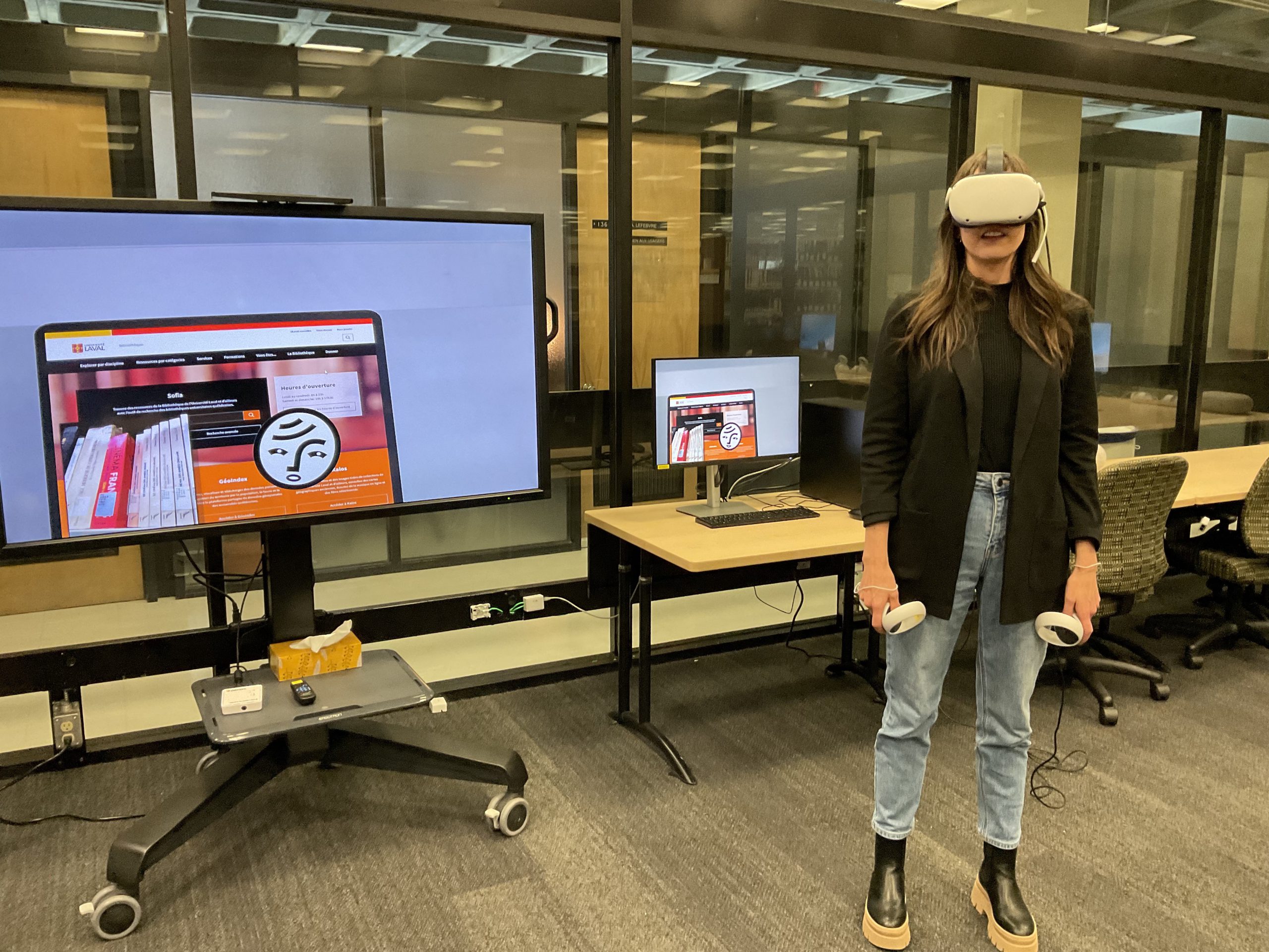 In collaboration with the Université Laval Library and OVA, the metaverse training project took place in an innovative space on the second floor of the Library. This space was equipped to accommodate an interdisciplinary group of undergraduate and graduate students to experiment with the StellarX software and to design and develop training adapted to the users of ULaval’s library.