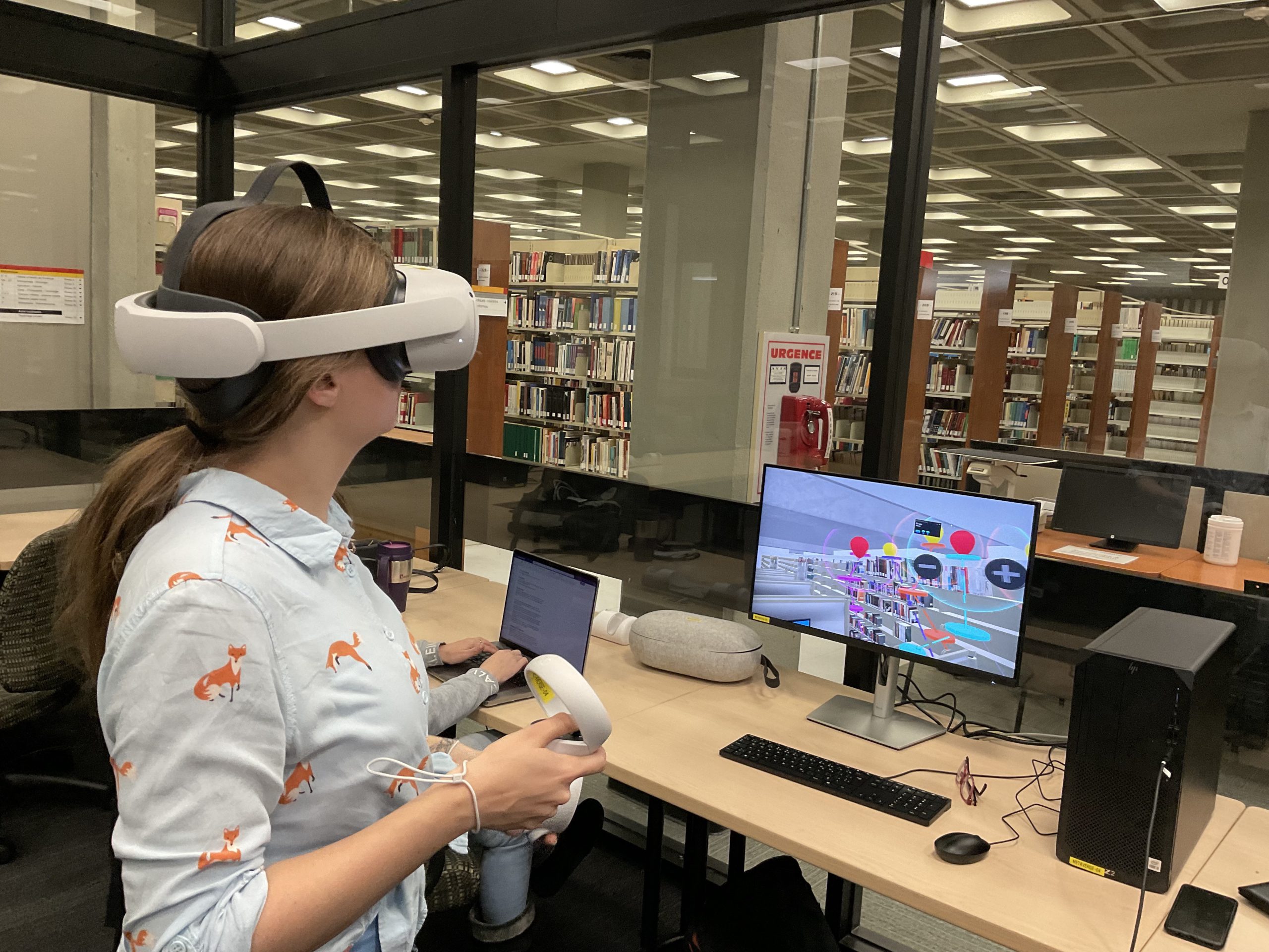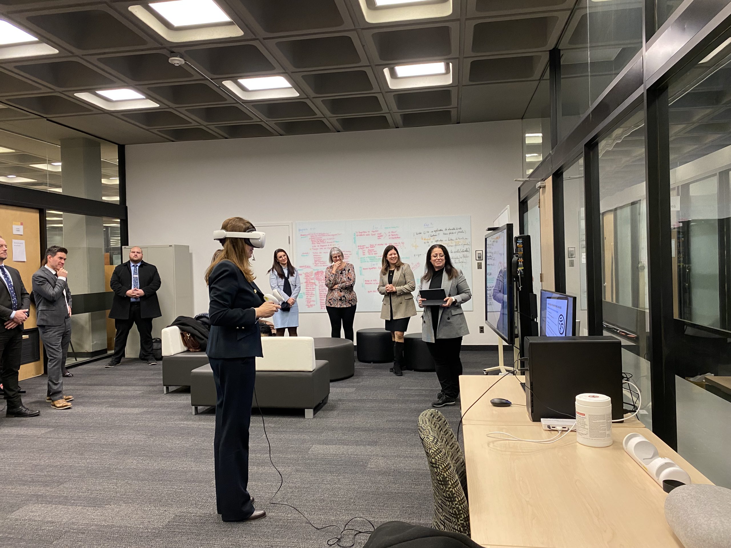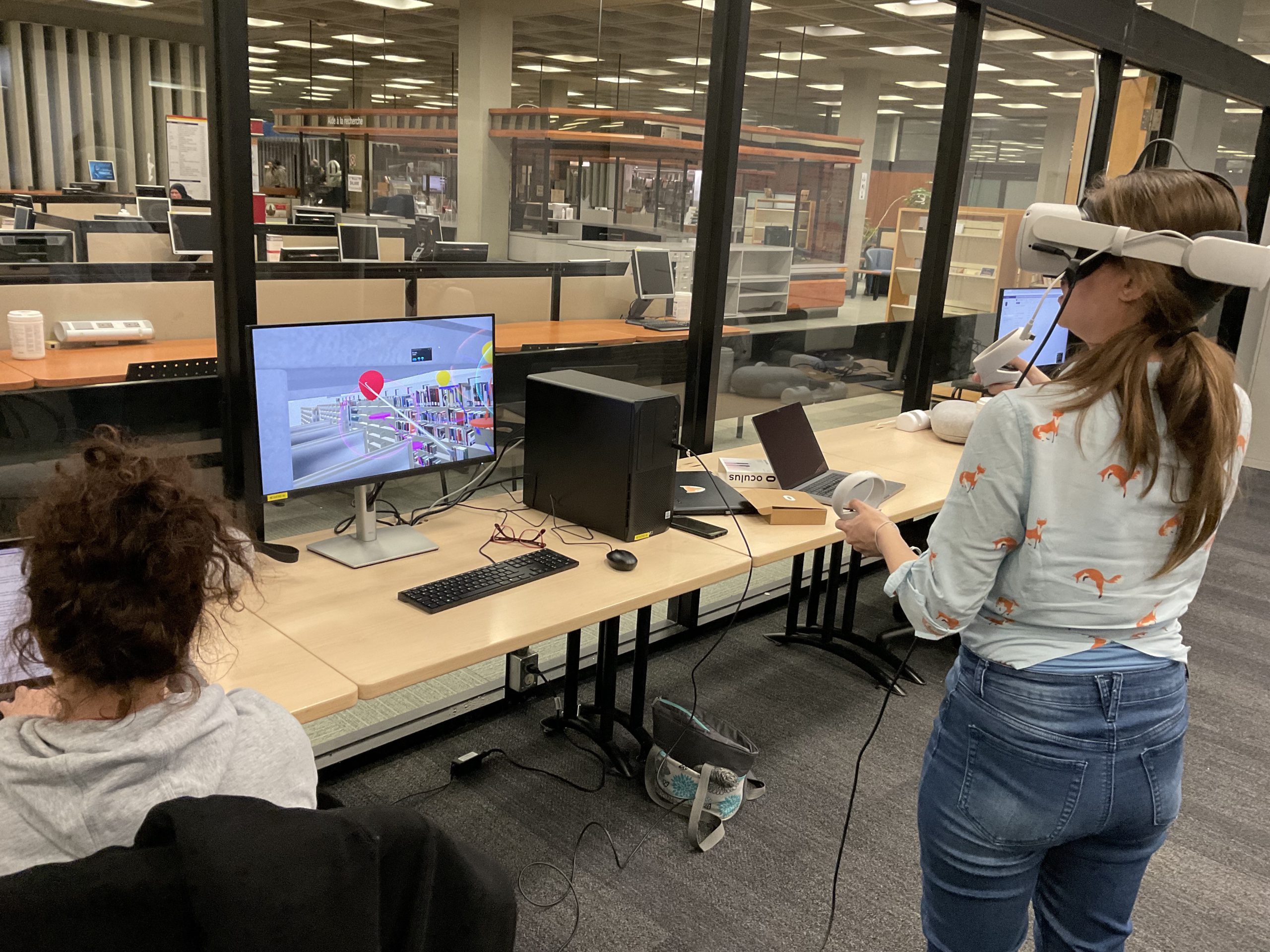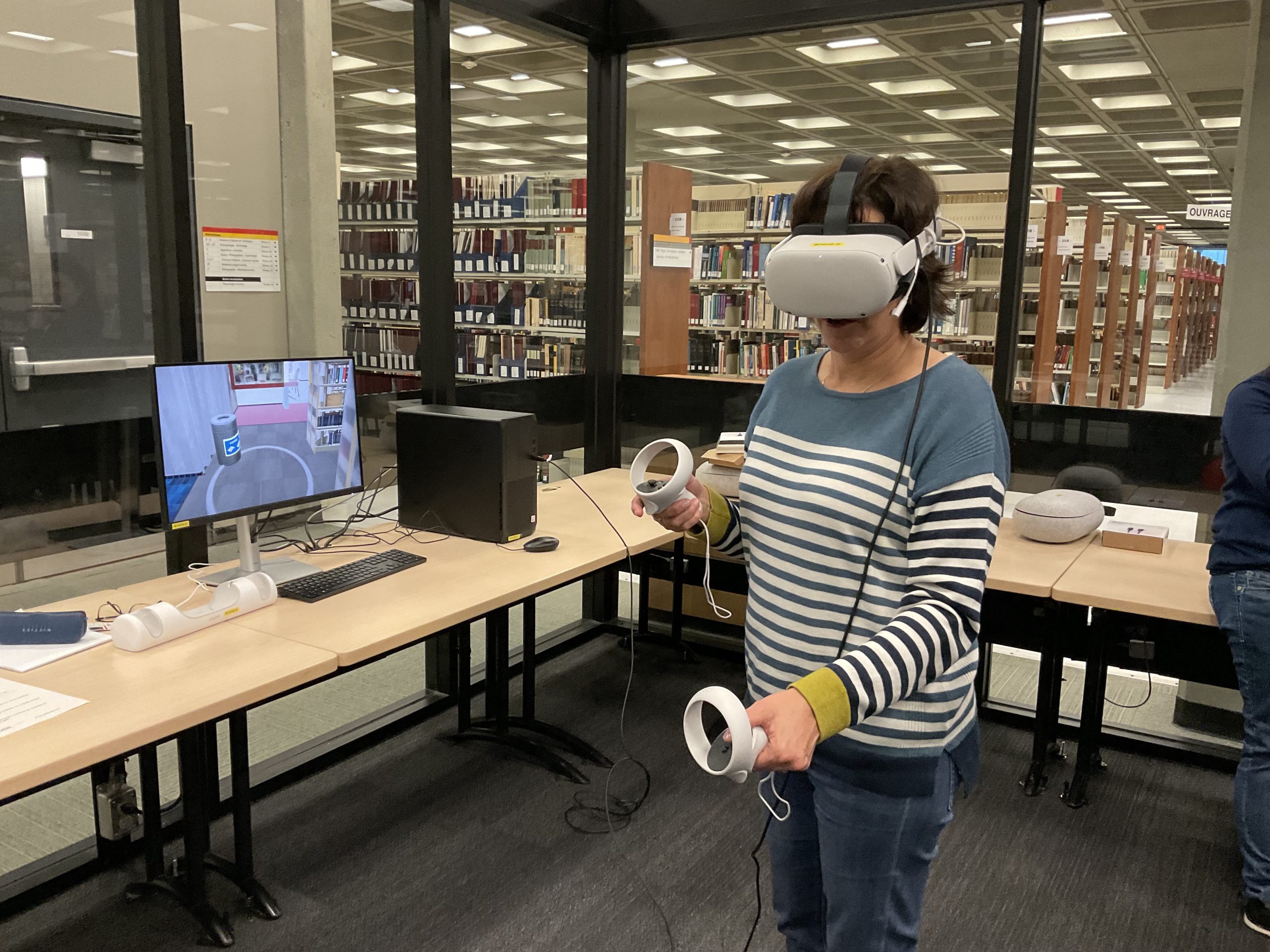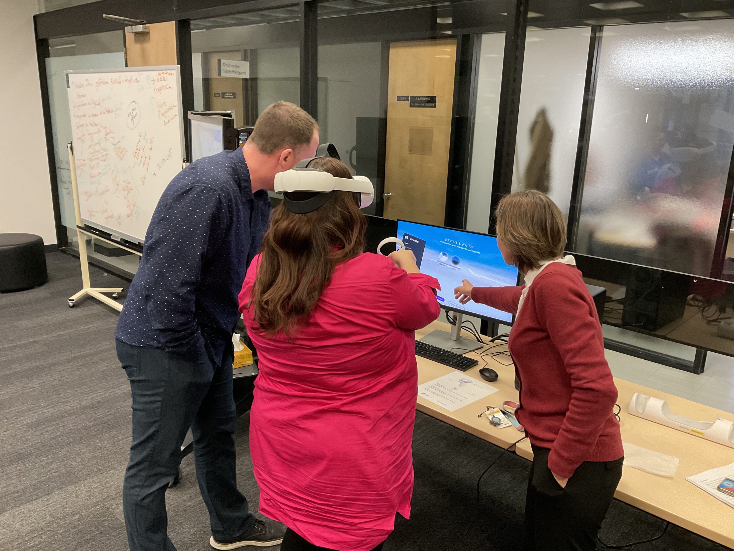 In collaboration with the Université Laval Library and OVA, the metaverse training project took place in an innovative space on the second floor of the Library. This space was equipped to accommodate an interdisciplinary group of undergraduate and graduate students to experiment with the StellarX software and to design and develop training adapted to the users of ULaval’s library.