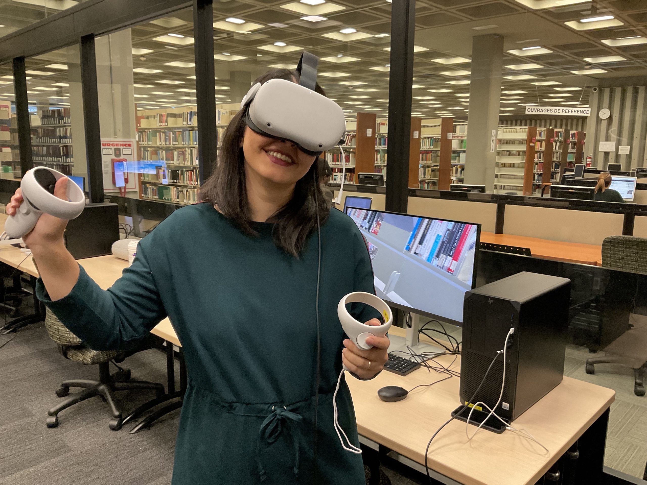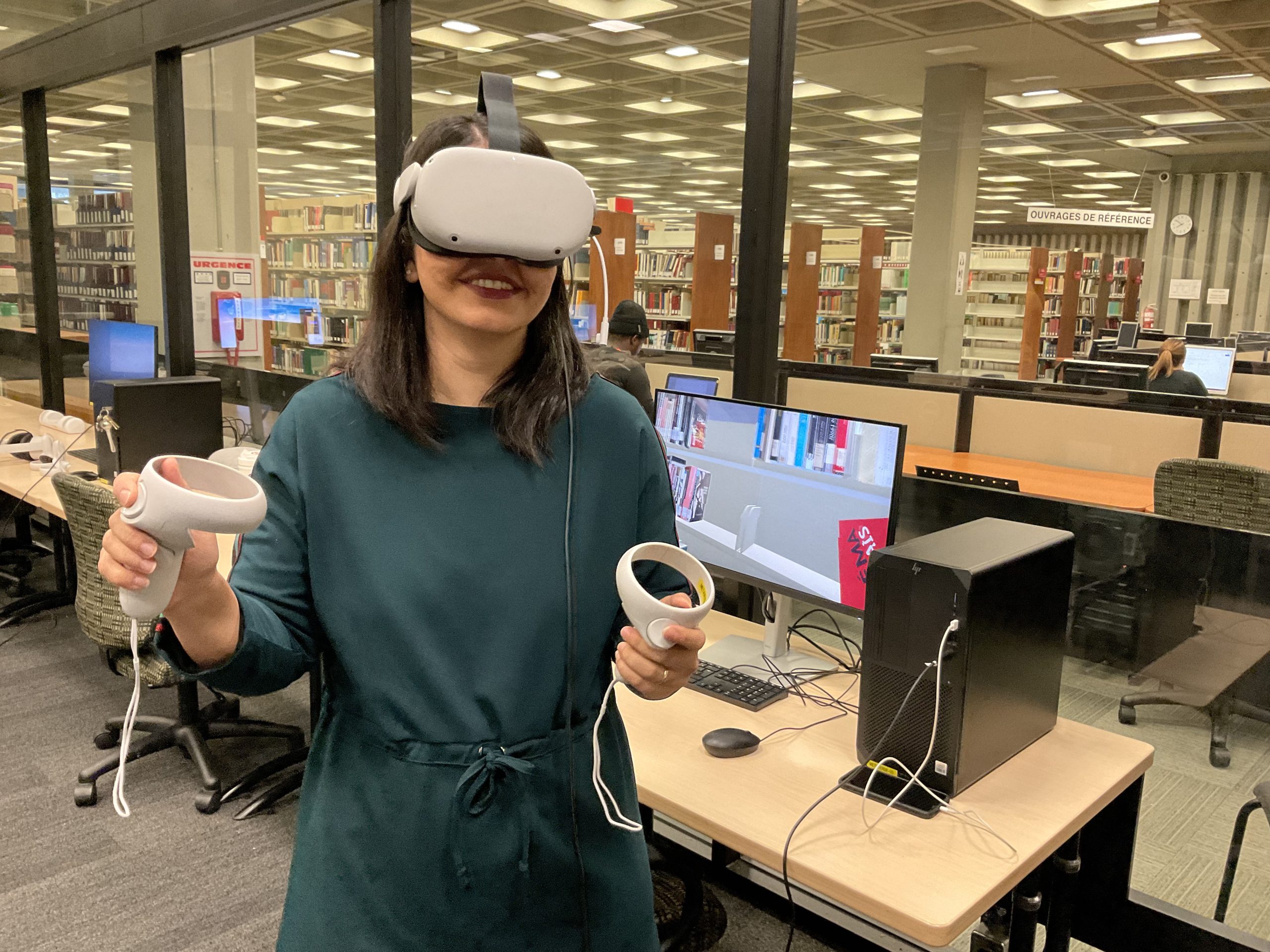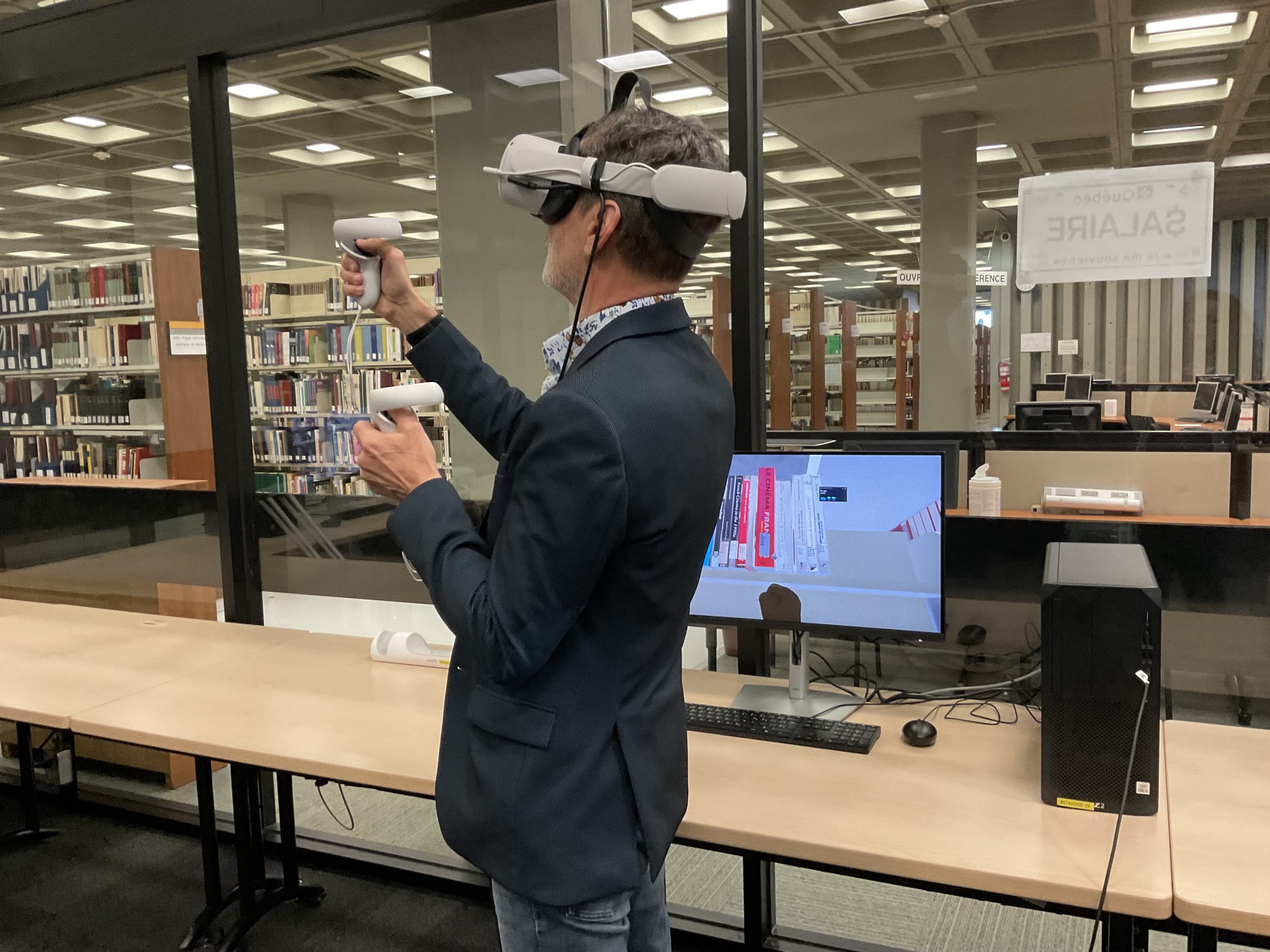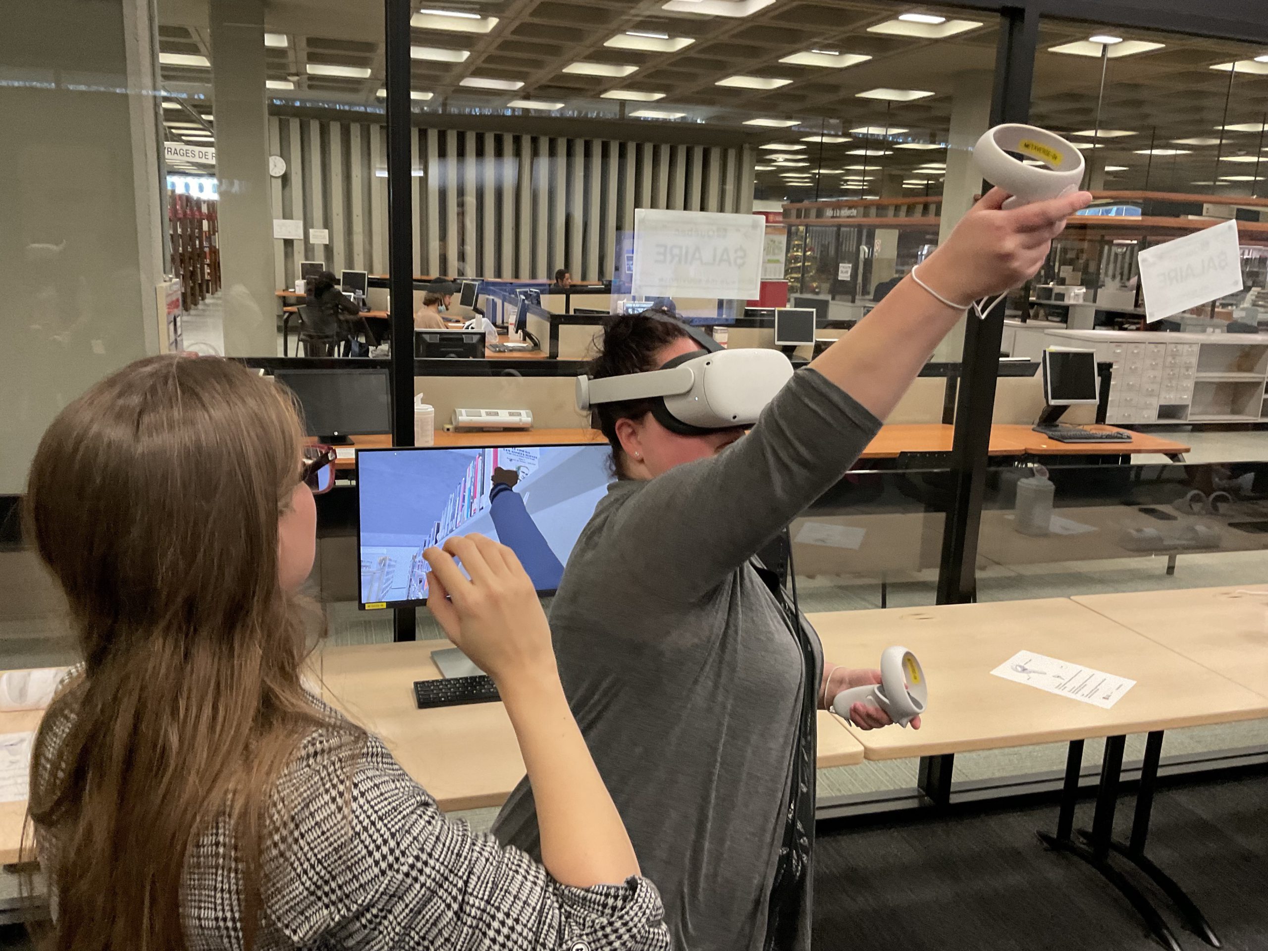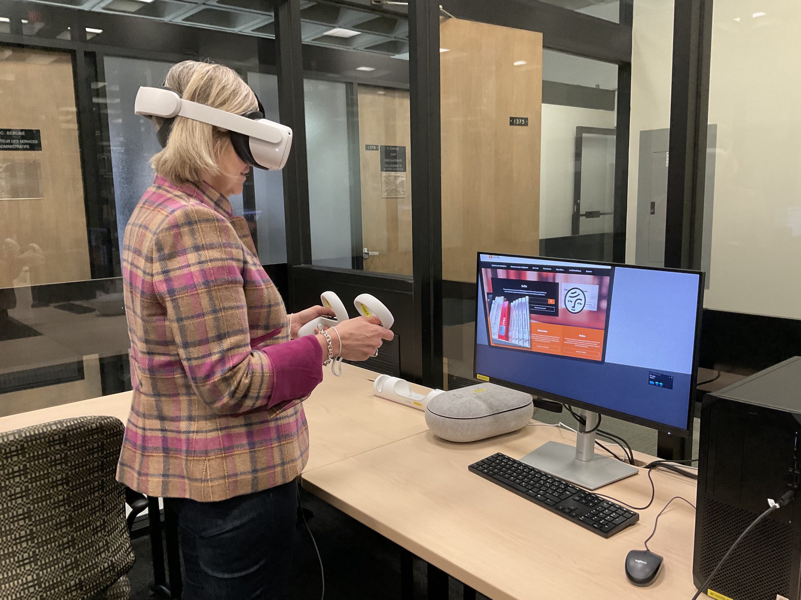 In collaboration with the Université Laval Library and OVA, the metaverse training project took place in an innovative space on the second floor of the Library. This space was equipped to accommodate an interdisciplinary group of undergraduate and graduate students to experiment with the StellarX software and to design and develop training adapted to the users of ULaval’s library.