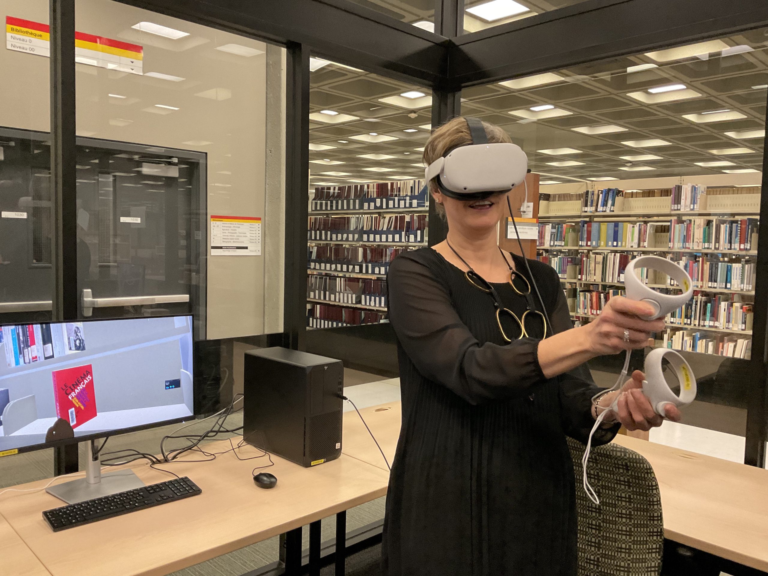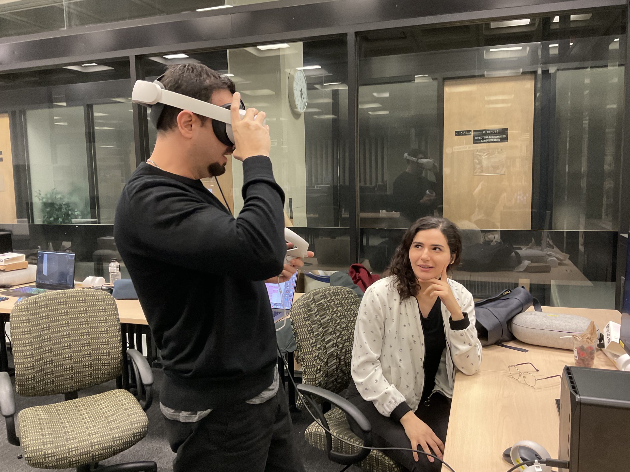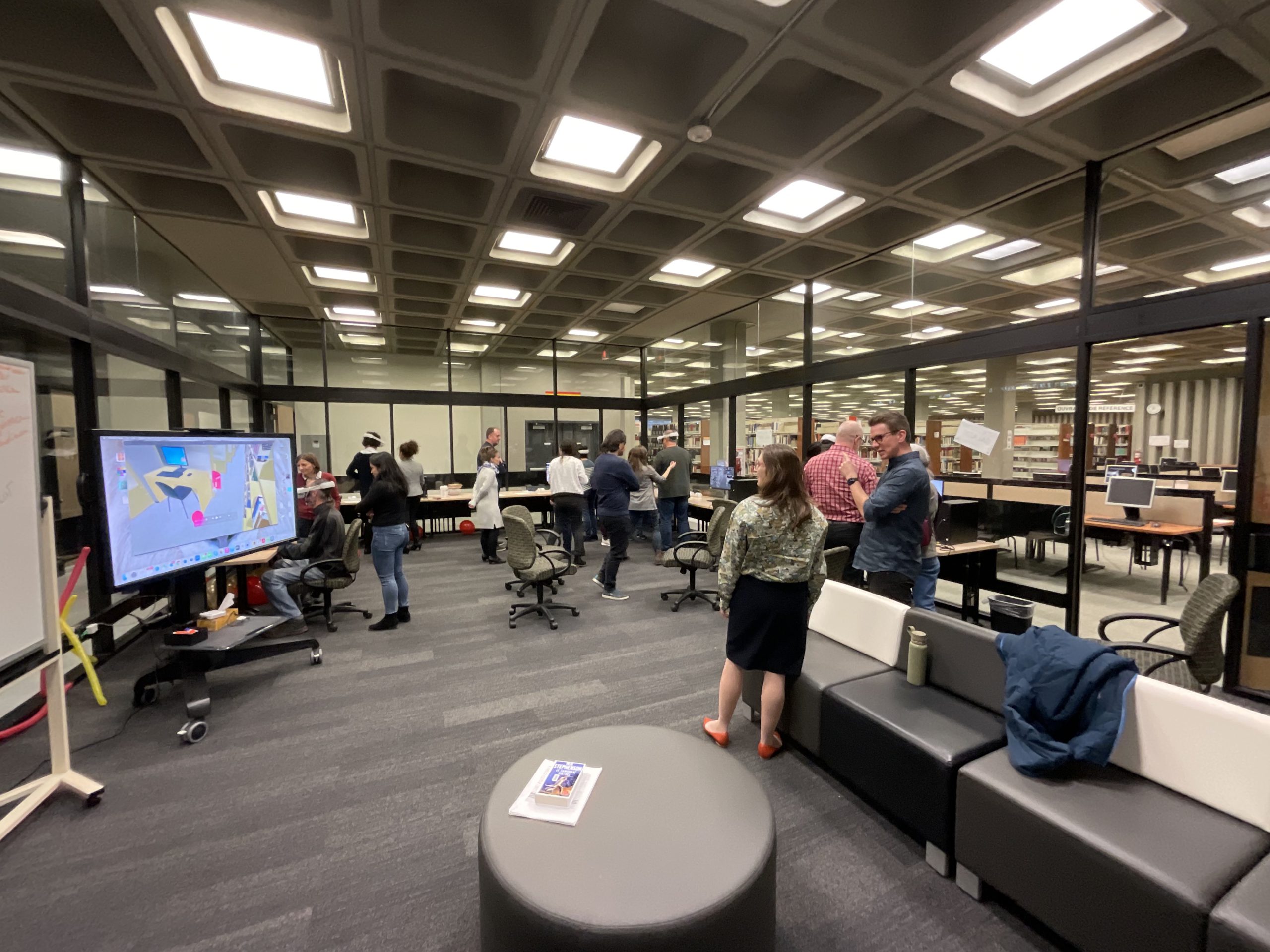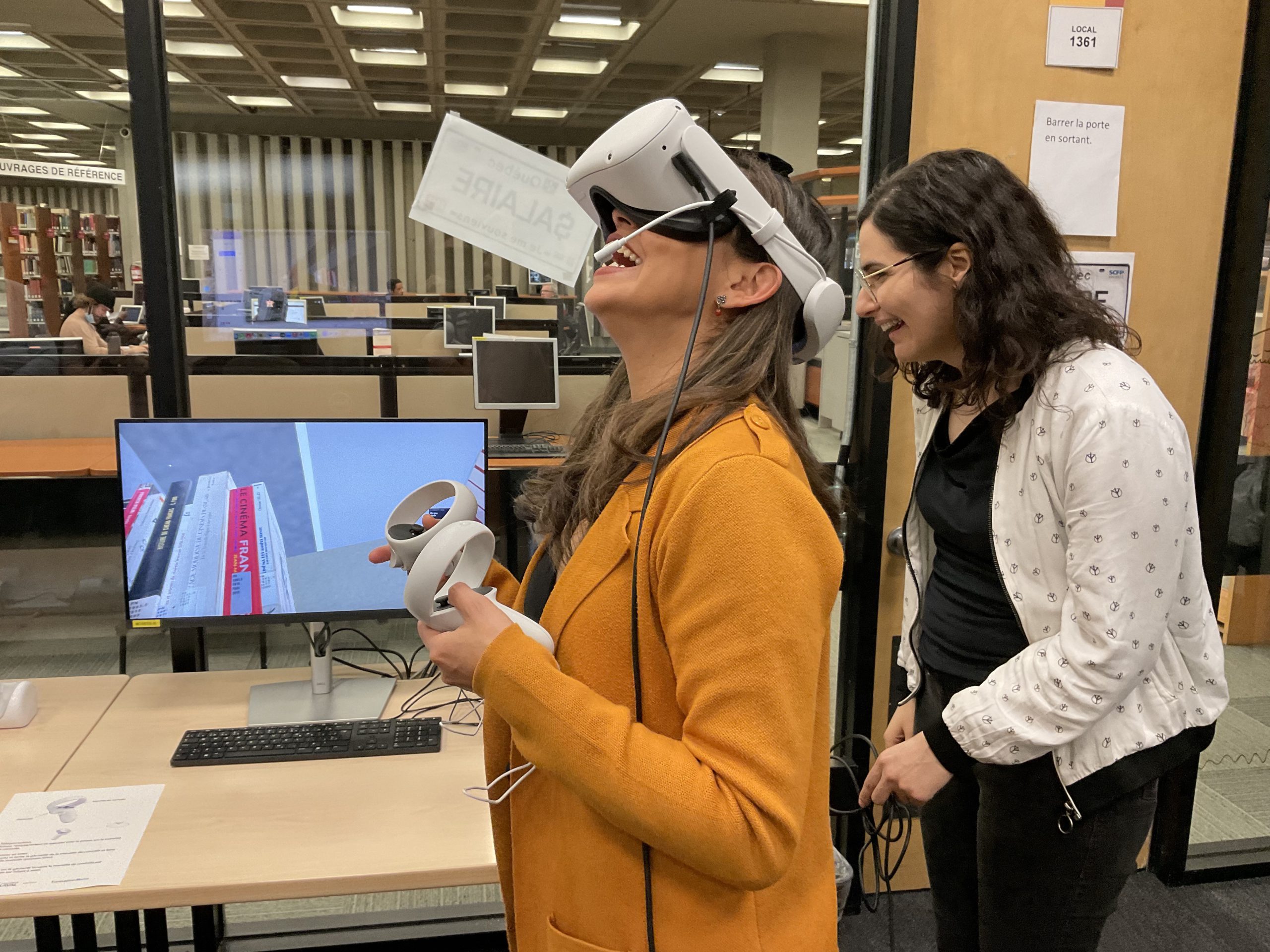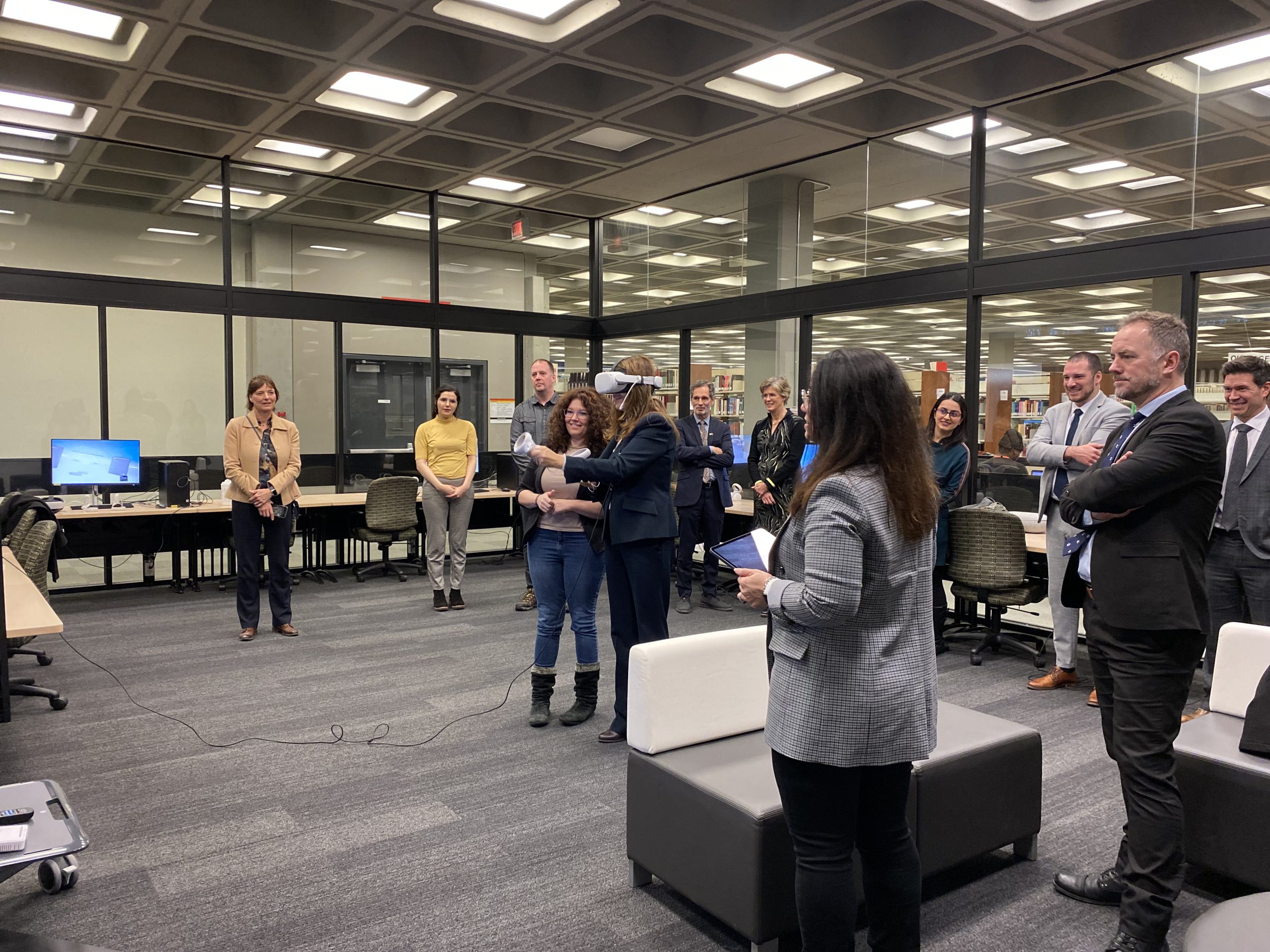 In collaboration with the Université Laval Library and OVA, the metaverse training project took place in an innovative space on the second floor of the Library. This space was equipped to accommodate an interdisciplinary group of undergraduate and graduate students to experiment with the StellarX software and to design and develop training adapted to the users of ULaval’s library.