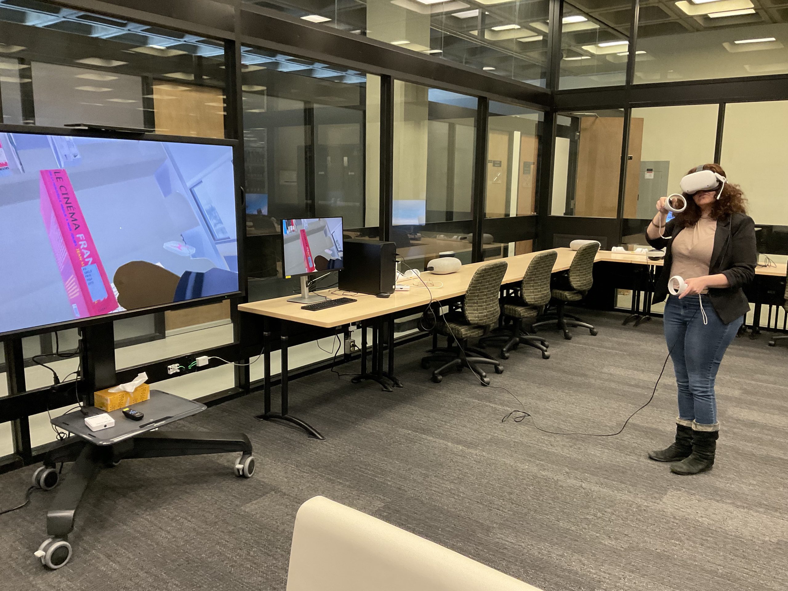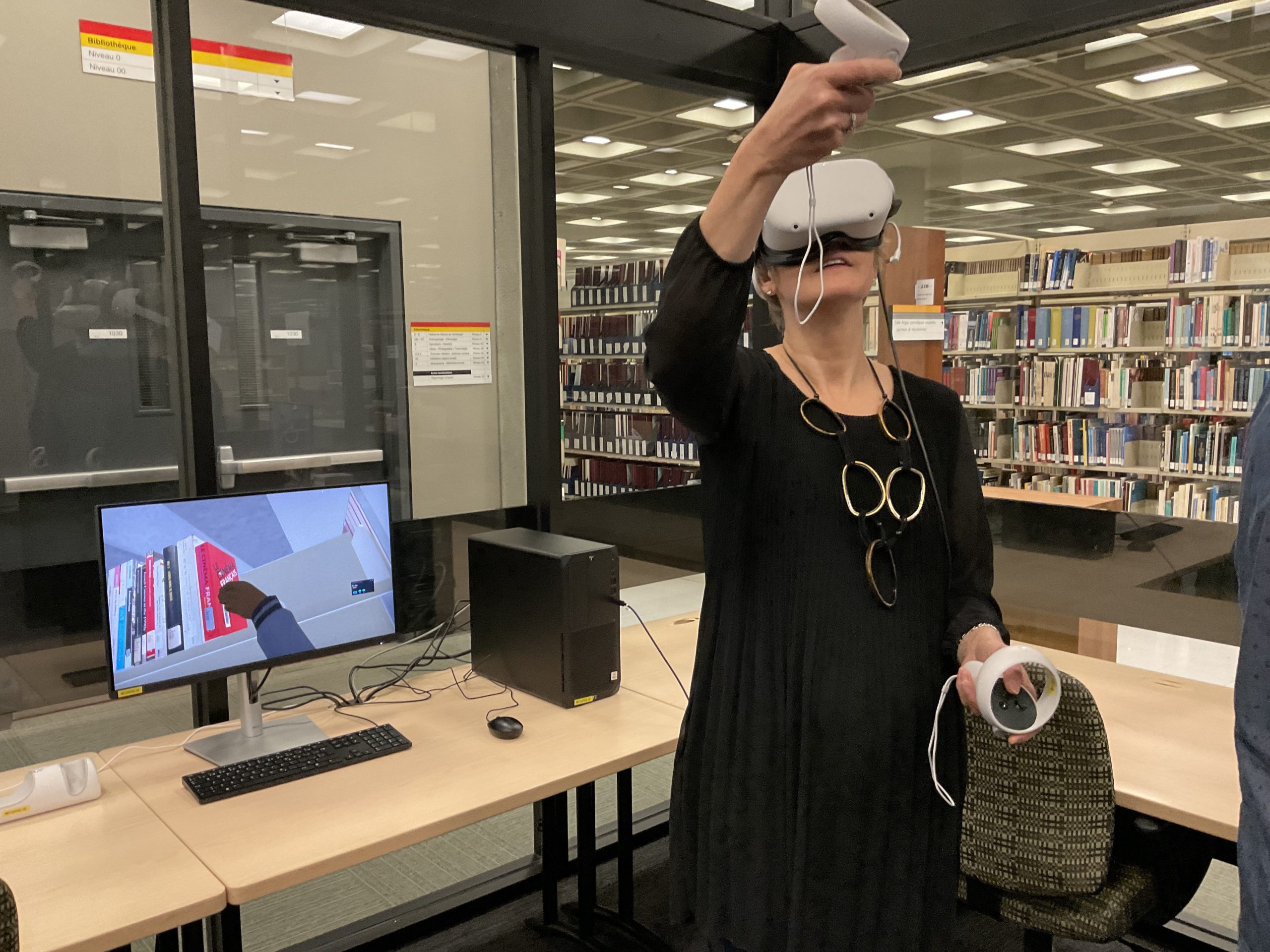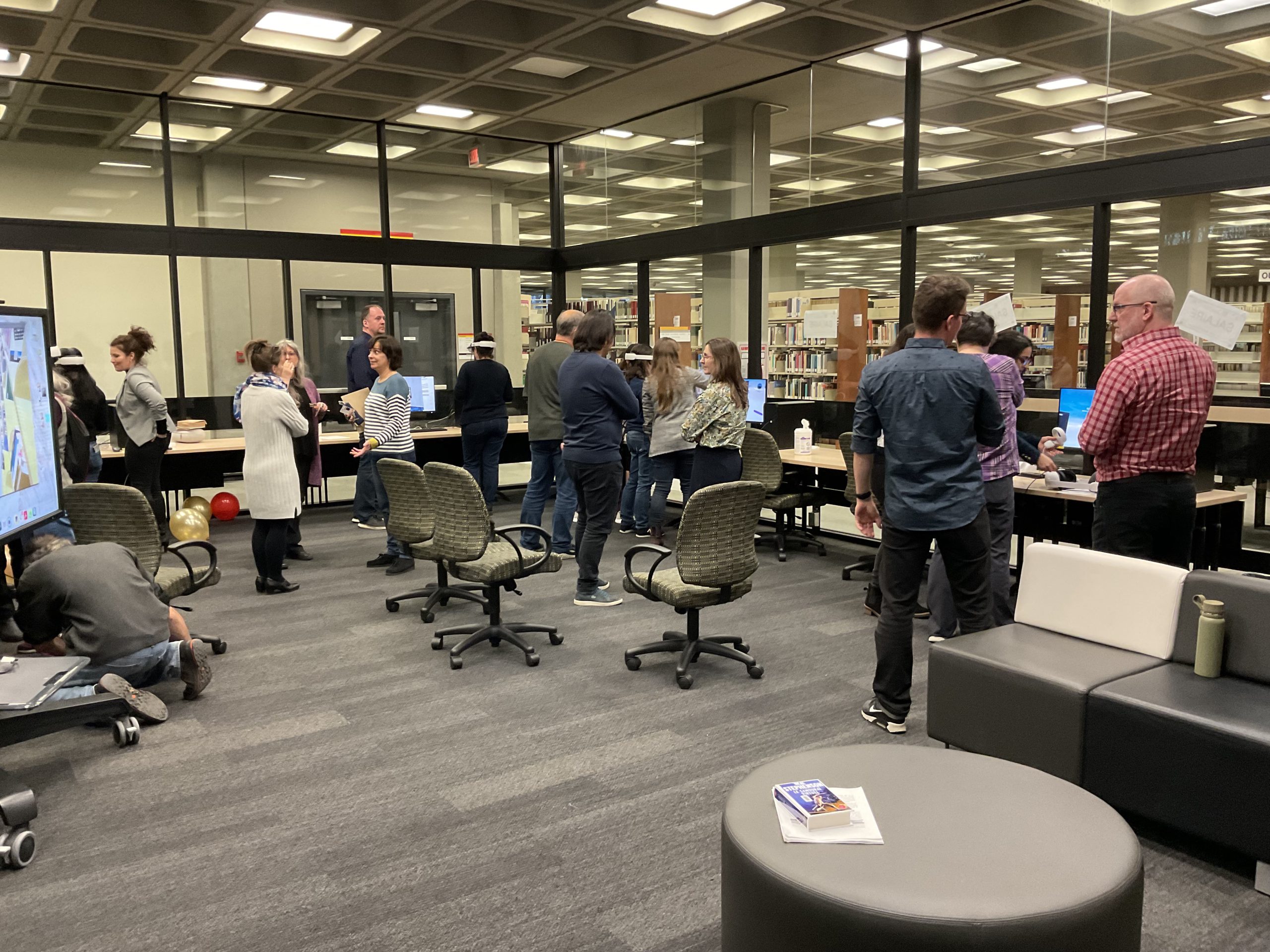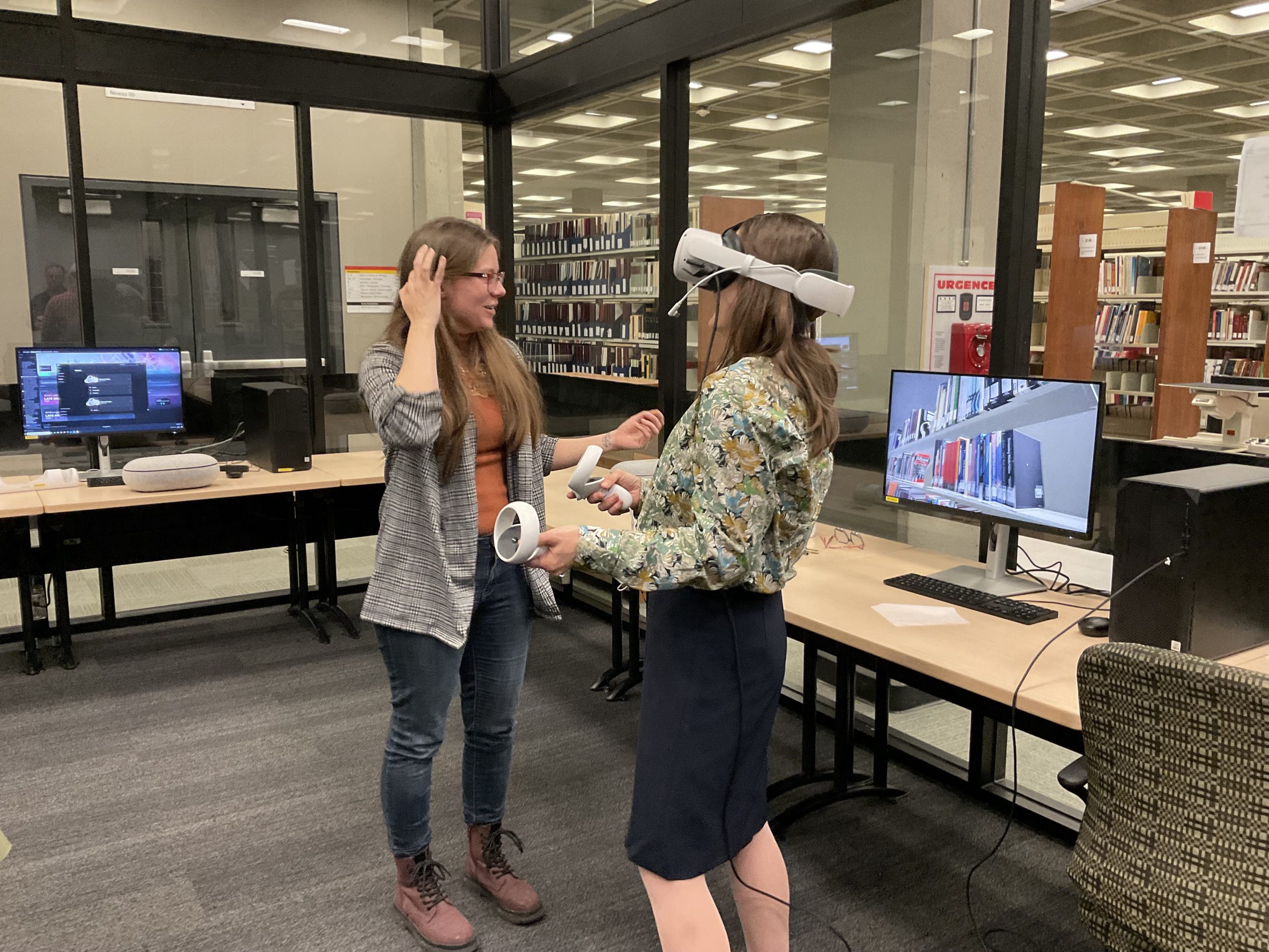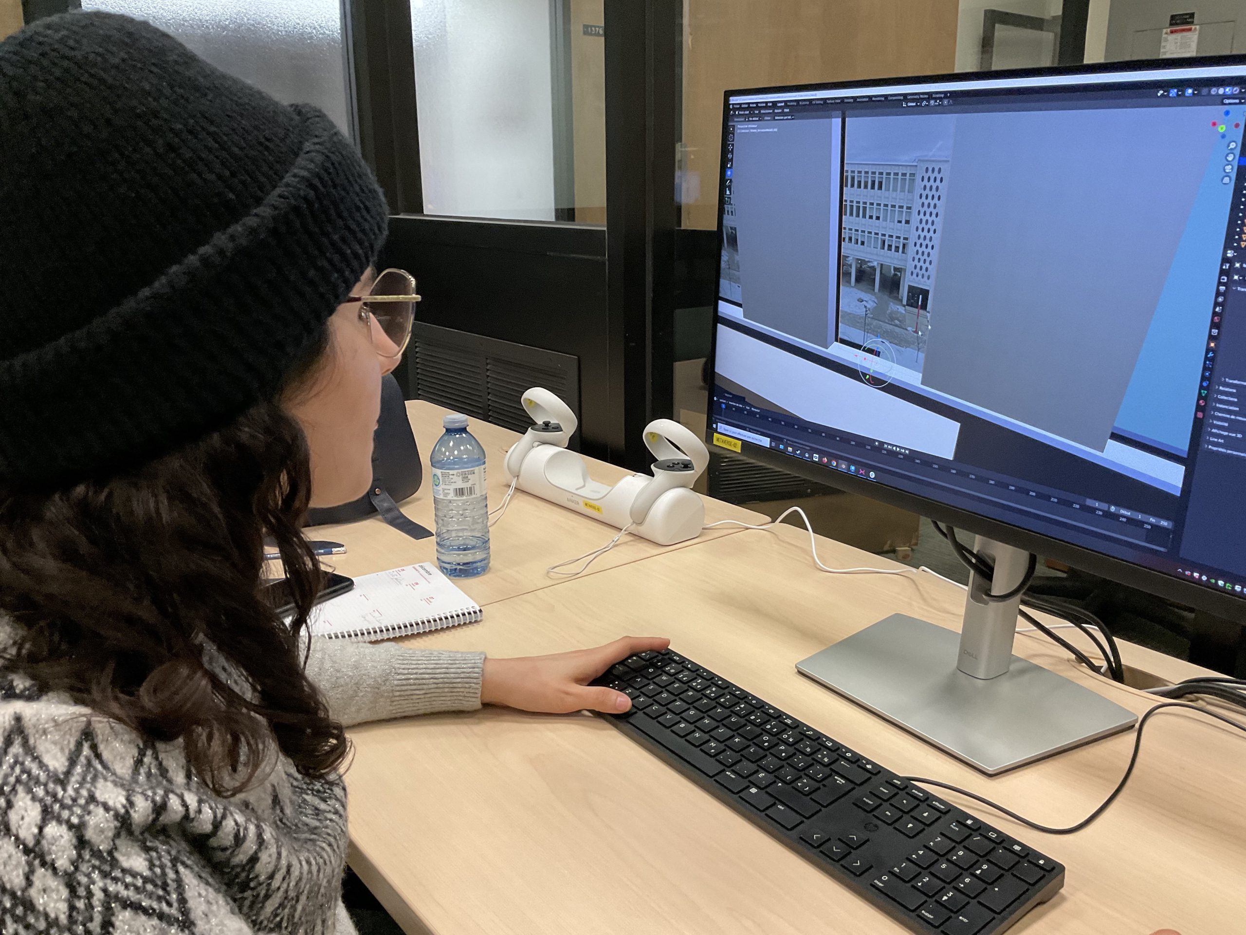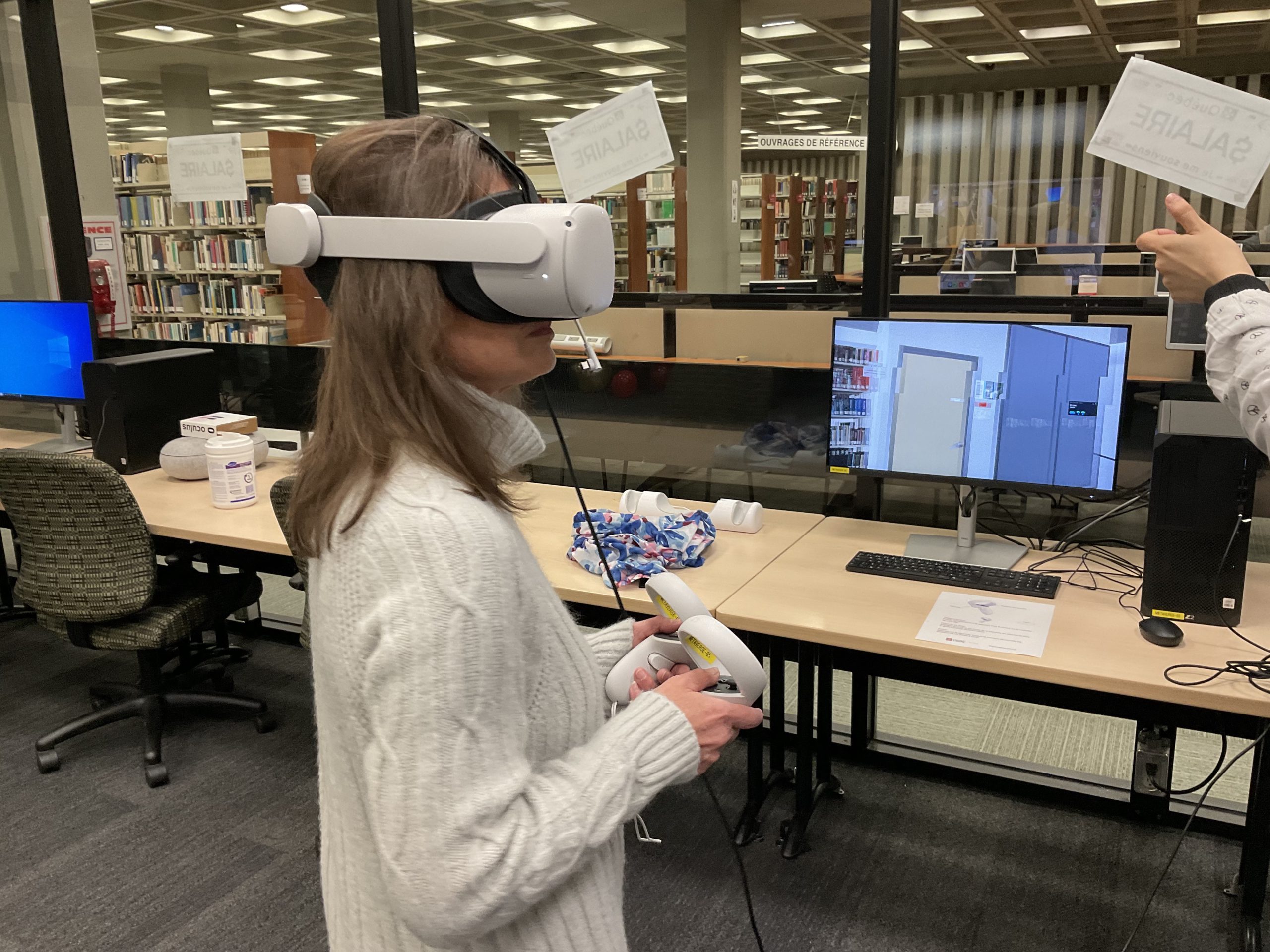 In collaboration with the Université Laval Library and OVA, the metaverse training project took place in an innovative space on the second floor of the Library. This space was equipped to accommodate an interdisciplinary group of undergraduate and graduate students to experiment with the StellarX software and to design and develop training adapted to the users of ULaval’s library.