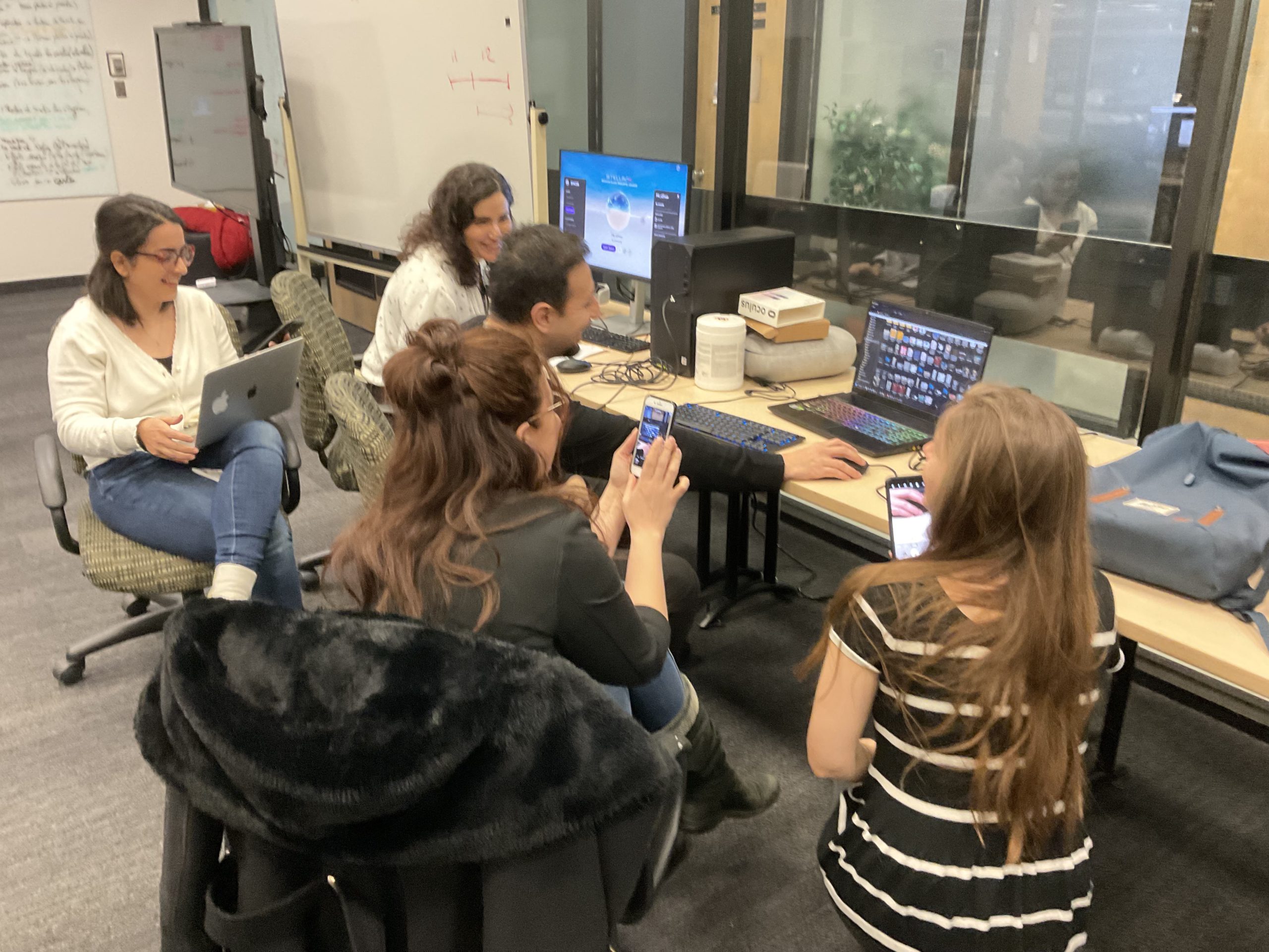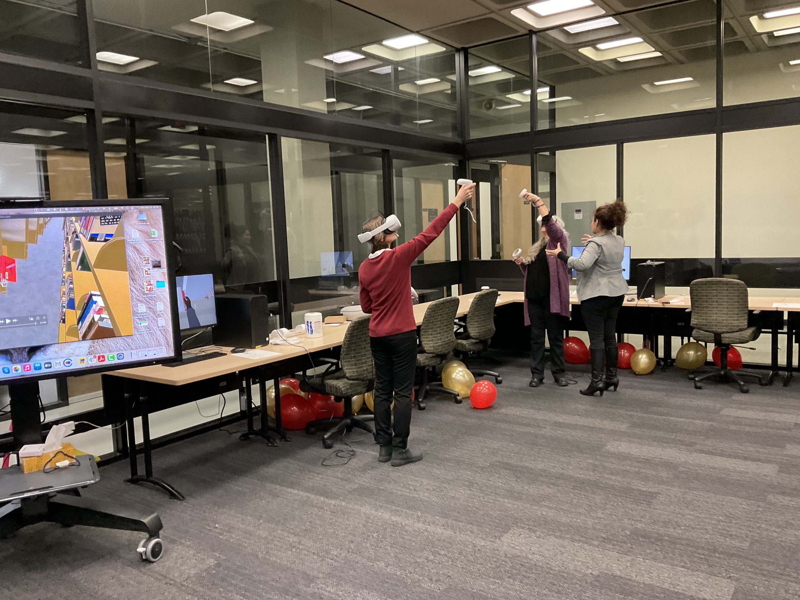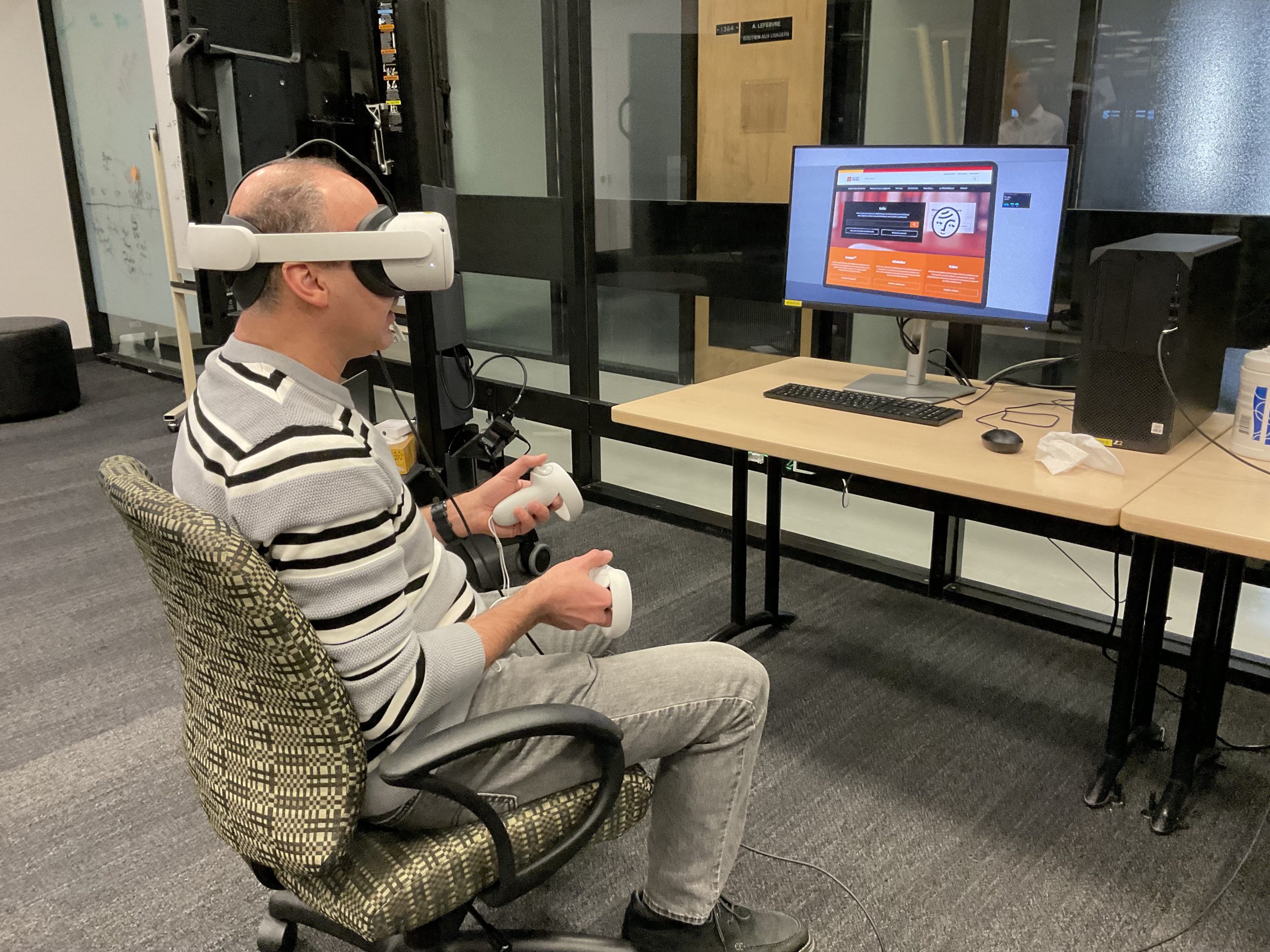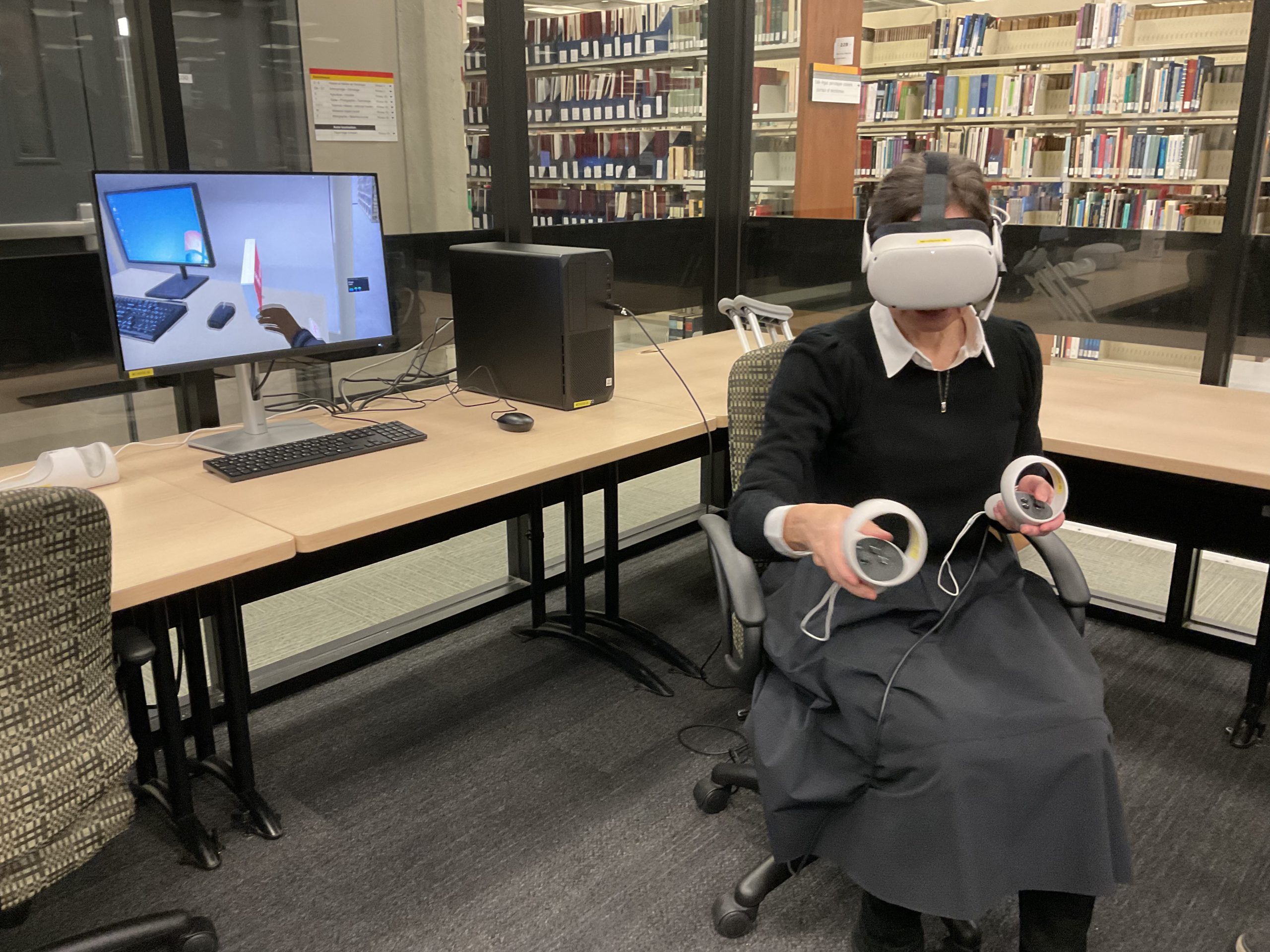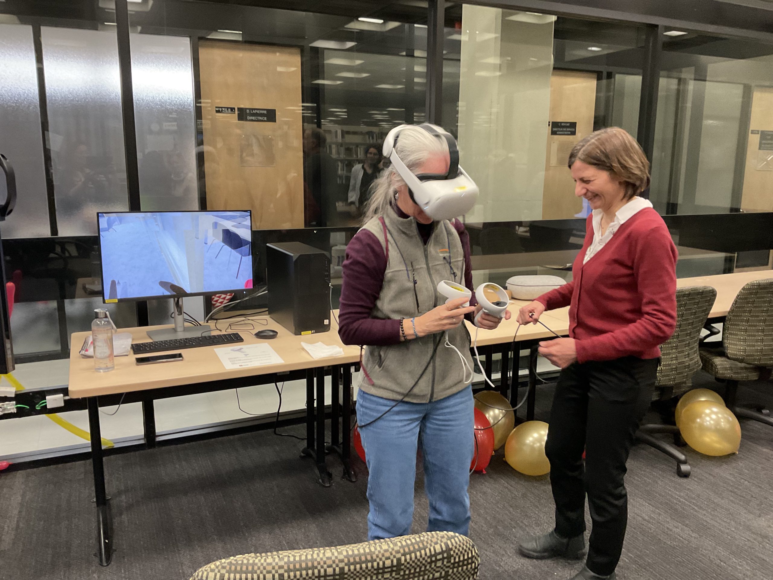 In collaboration with the Université Laval Library and OVA, the metaverse training project took place in an innovative space on the second floor of the Library. This space was equipped to accommodate an interdisciplinary group of undergraduate and graduate students to experiment with the StellarX software and to design and develop training adapted to the users of ULaval’s library.