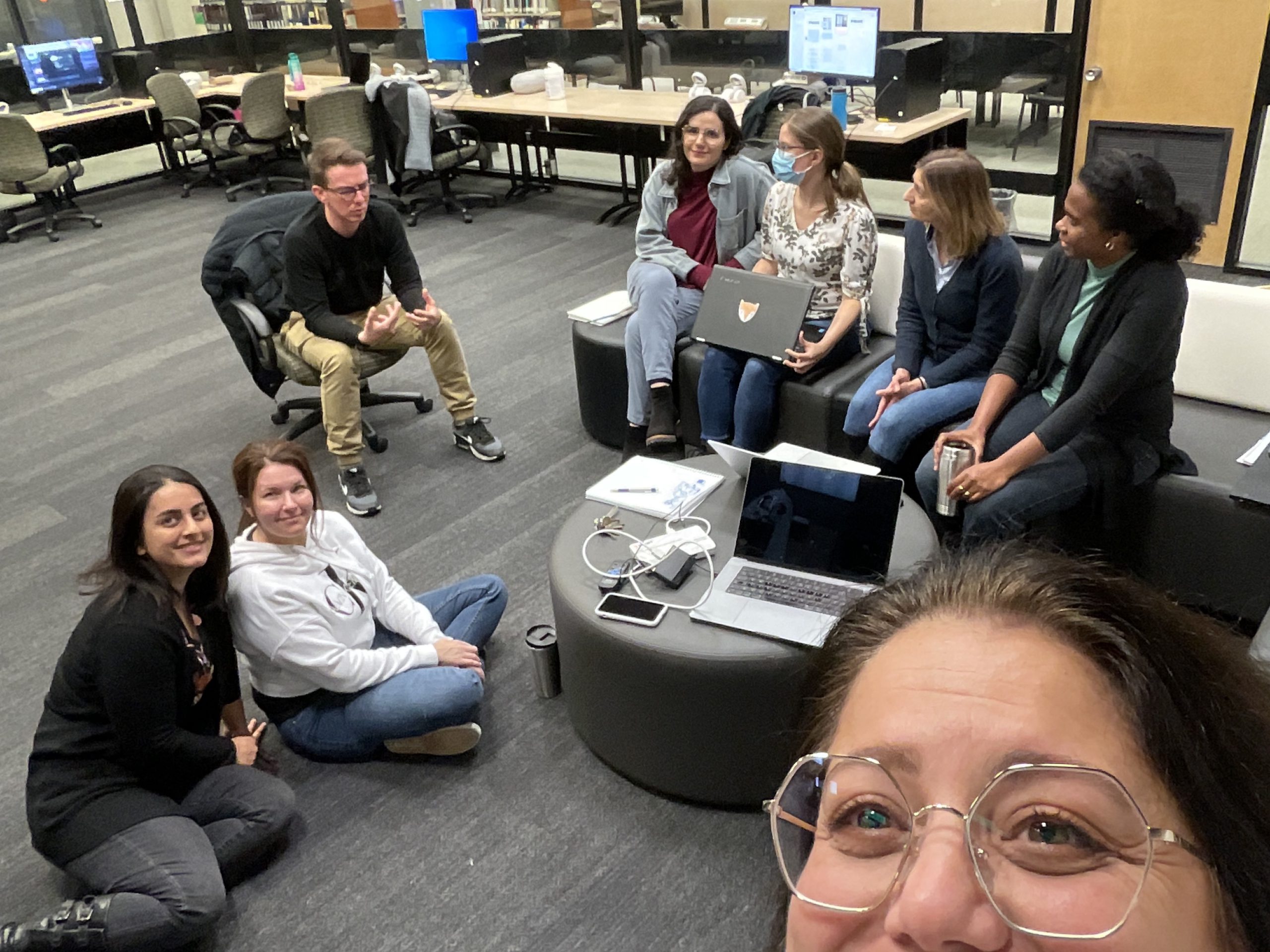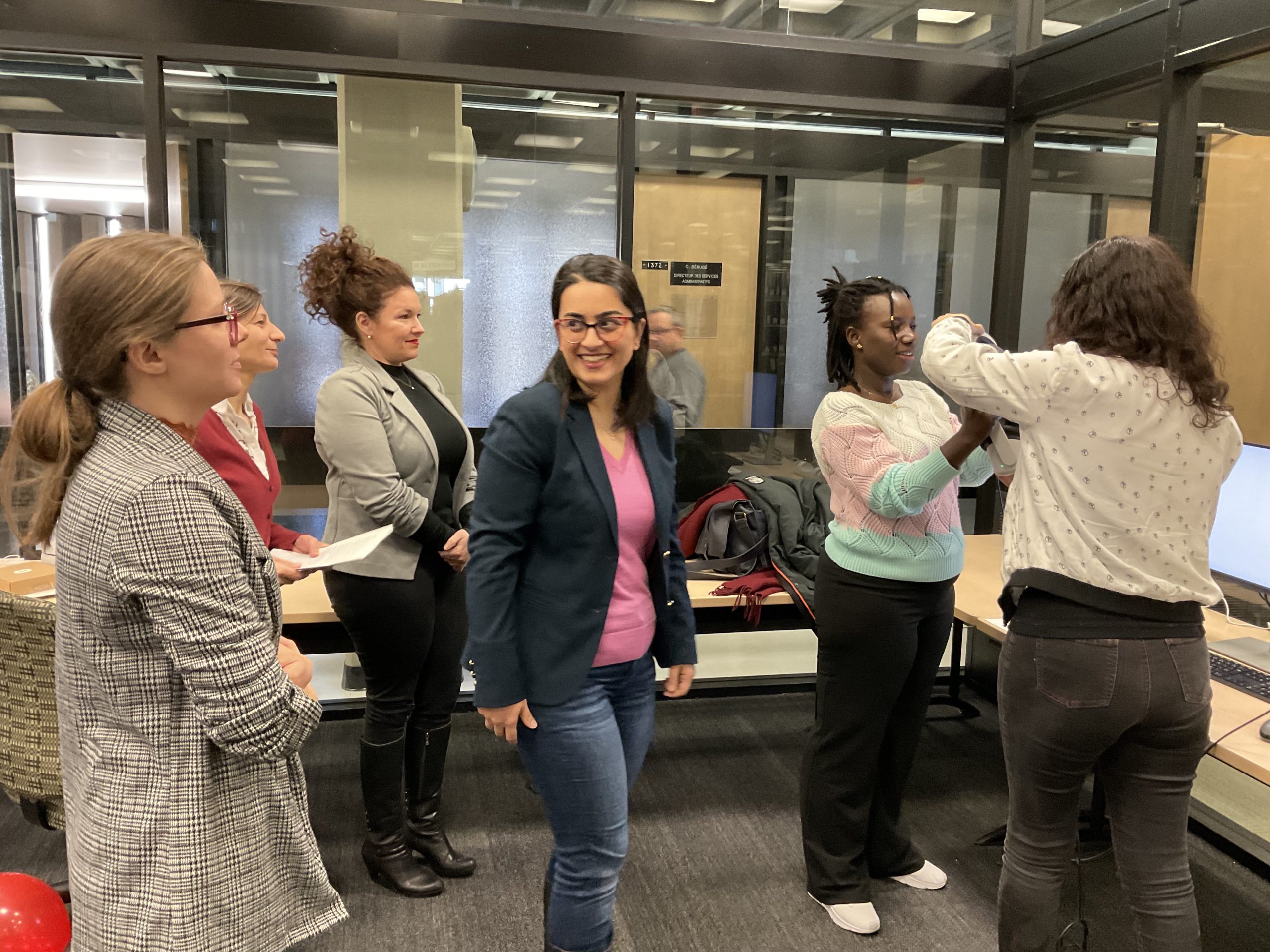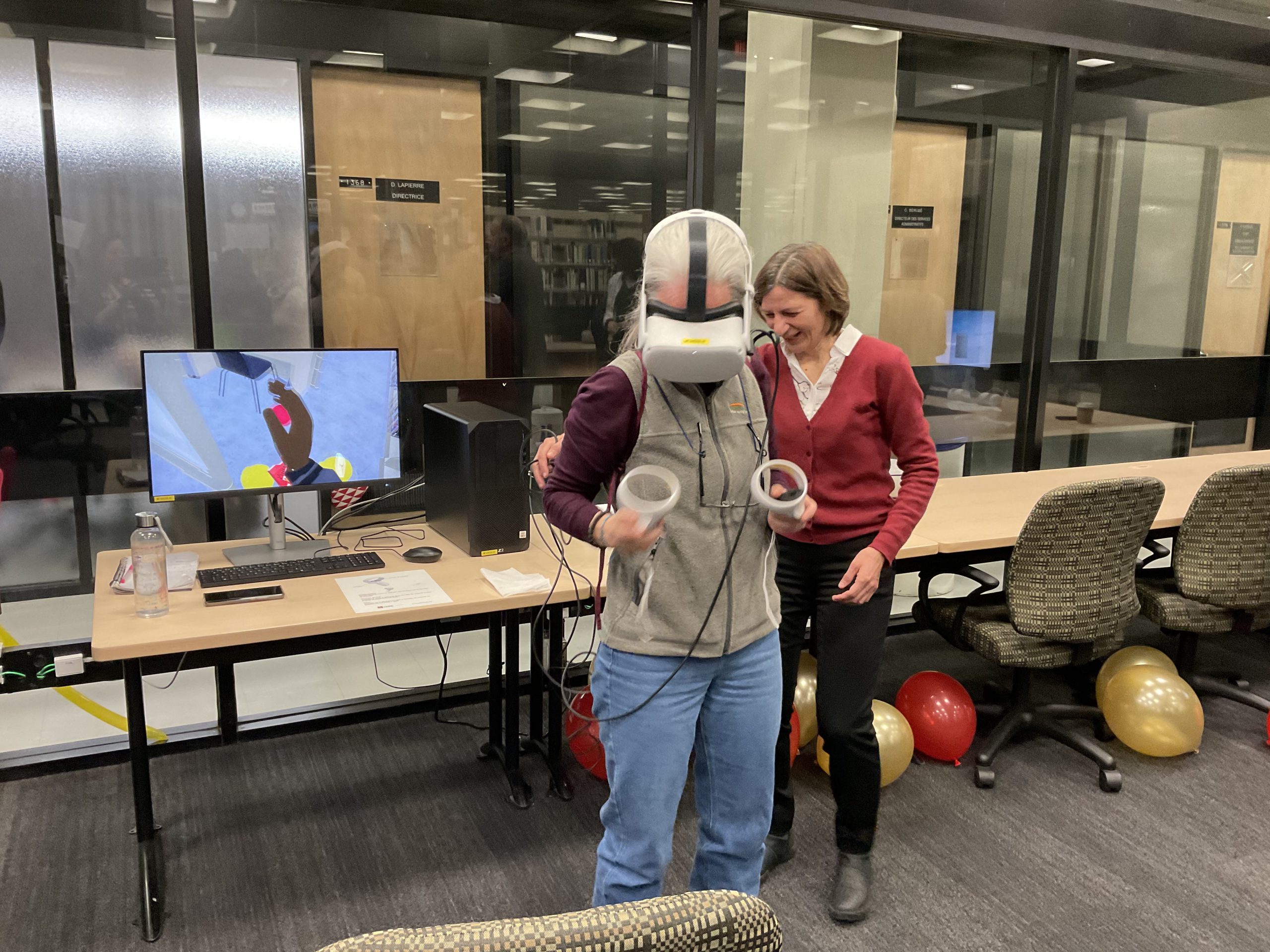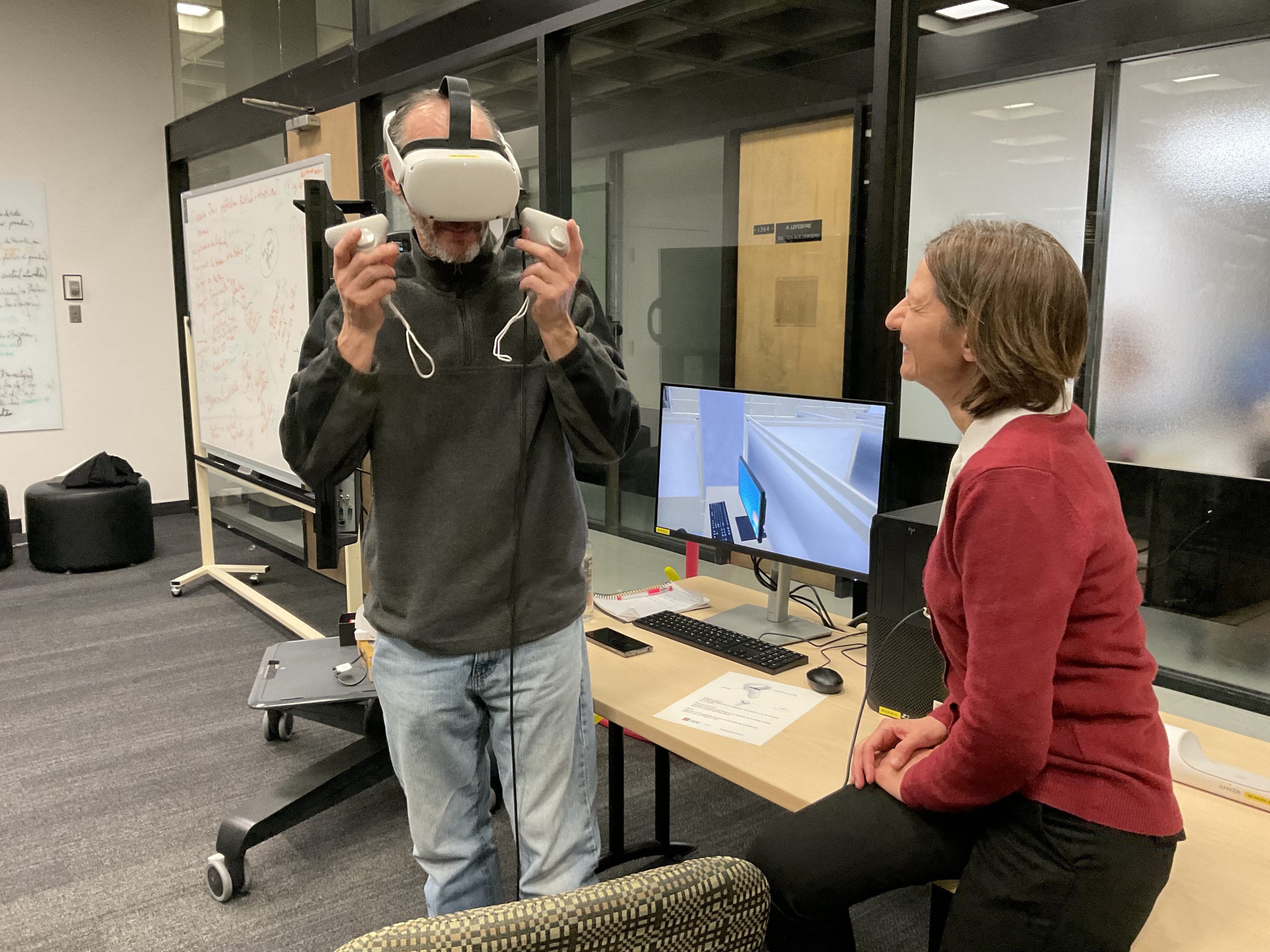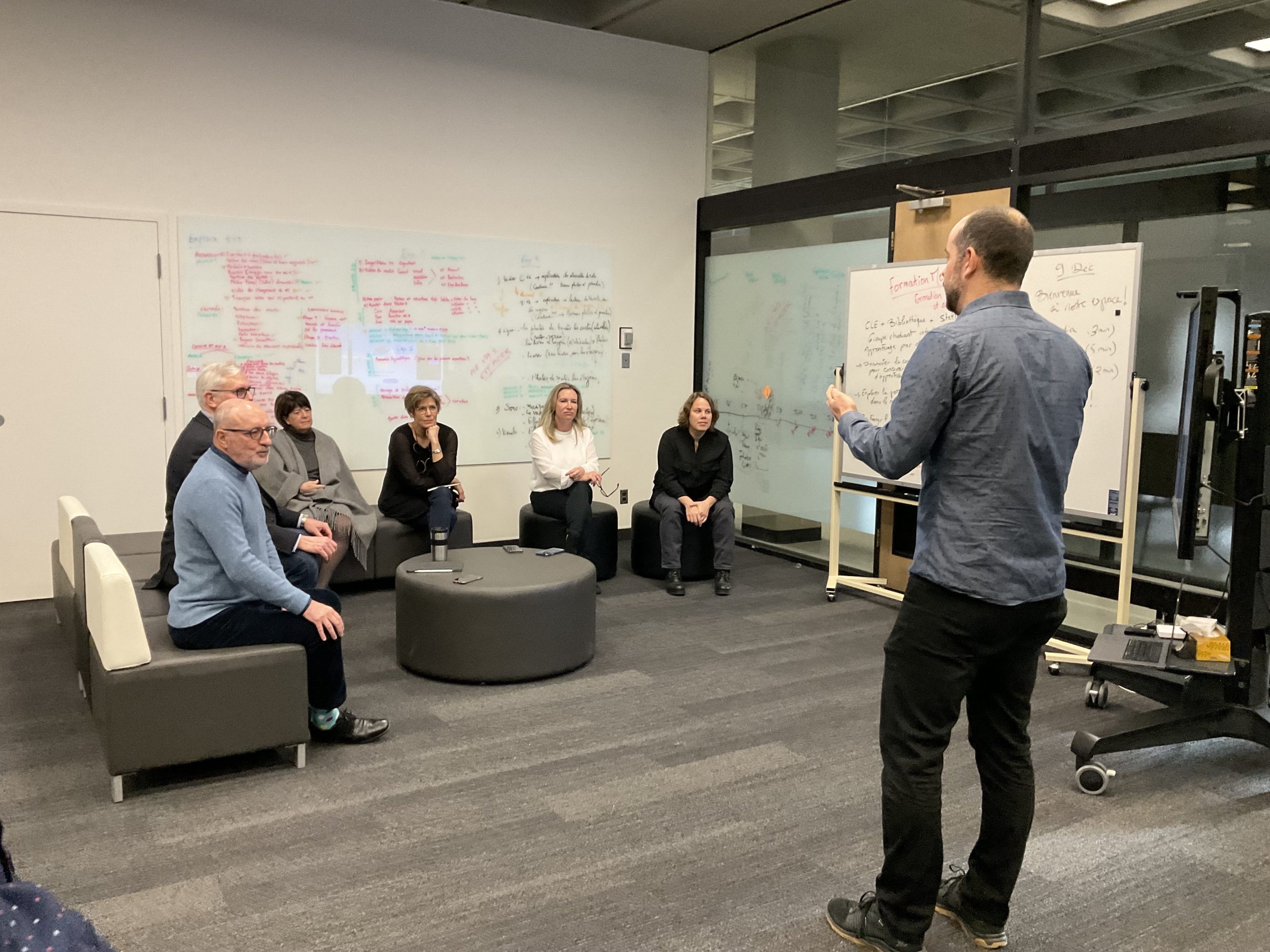 In collaboration with the Université Laval Library and OVA, the metaverse training project took place in an innovative space on the second floor of the Library. This space was equipped to accommodate an interdisciplinary group of undergraduate and graduate students to experiment with the StellarX software and to design and develop training adapted to the users of ULaval’s library.