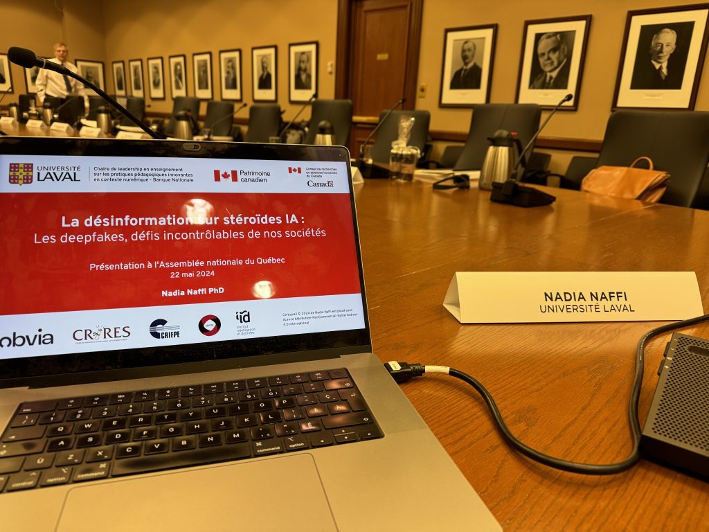 - Naffi, N. (Experte) (2024, 22 mai). La désinformation sur stéroïdes IA : Les deepfakes, défis incontrôlables de nos sociétés. Rencontre interparlementaire Québec Ontario. Assemblée nationale du Québec